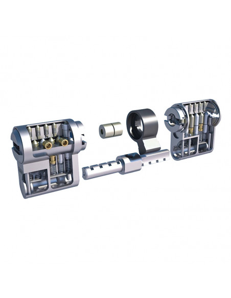 Doble embrague. Europerfil. excéntrica 15 mm. Puente de acero reforzado. Sistema antibumping, antiganzúa, con barra antirotura y protección antitaladro con pasadores de acero endurecido. Sistema INSPECT que protege técnica y legalmente contra copias no autorizadas. Incluye 5 llaves de cuello largo exclusivas Cadena 88.