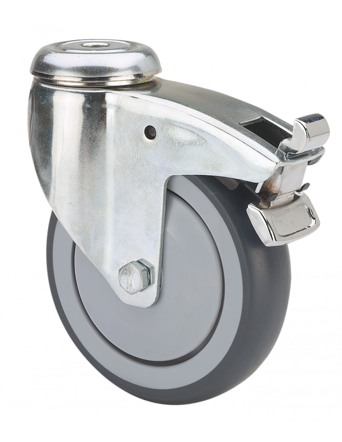 Ruedas con núcleo de poliamix y banda de goma gris natural. Especialmente indicadas para soportar cargas hasta 130 Kg. Es utilizada en cantina, comedor, restaurantes, supermercados, carros de alimentación, camas.