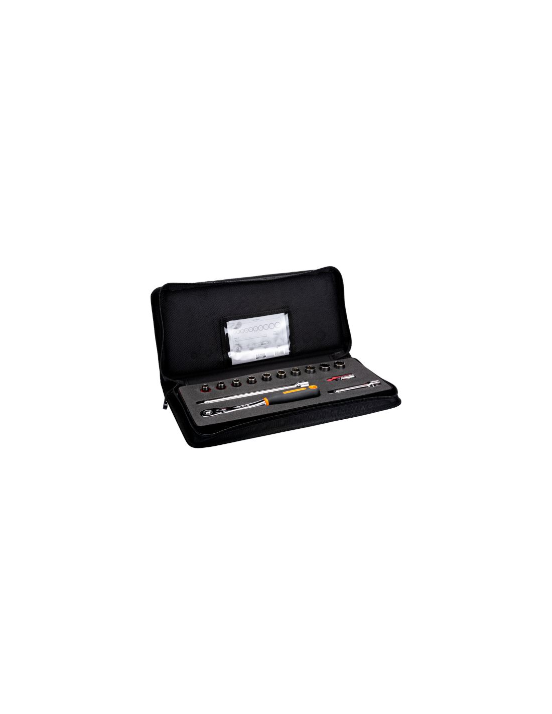 Juego de vasos con cuadrado de 1/2" con perfil bi-hexagonal métrico y maletín de poliéster para carraca de cabeza delgada