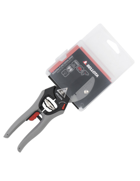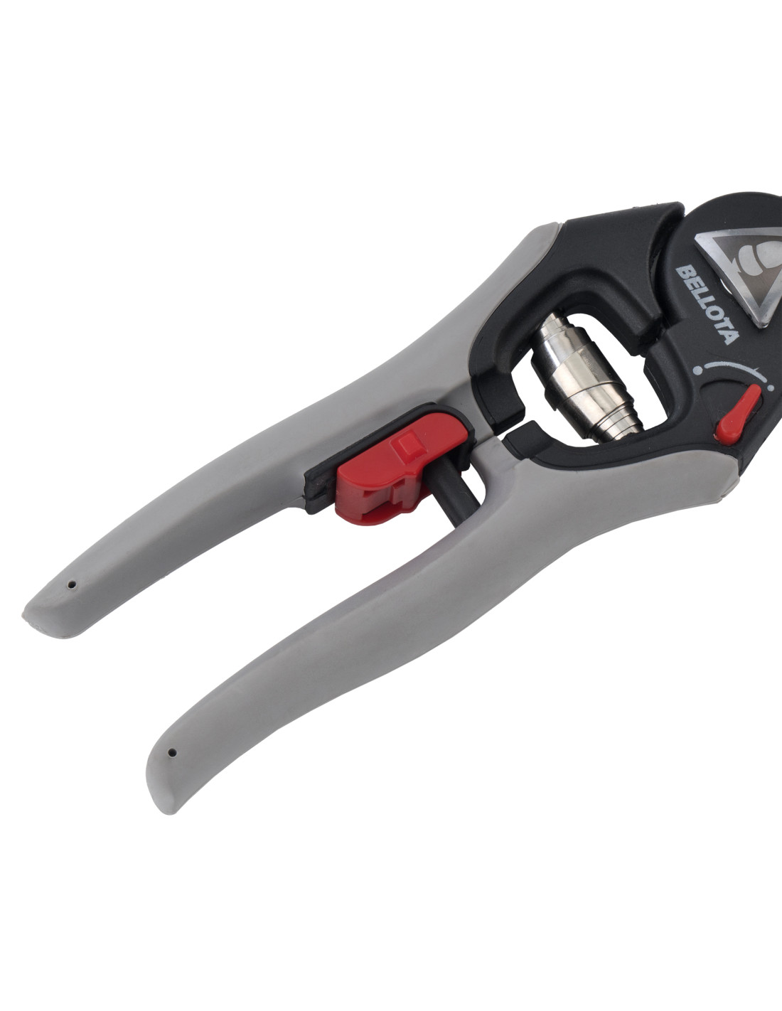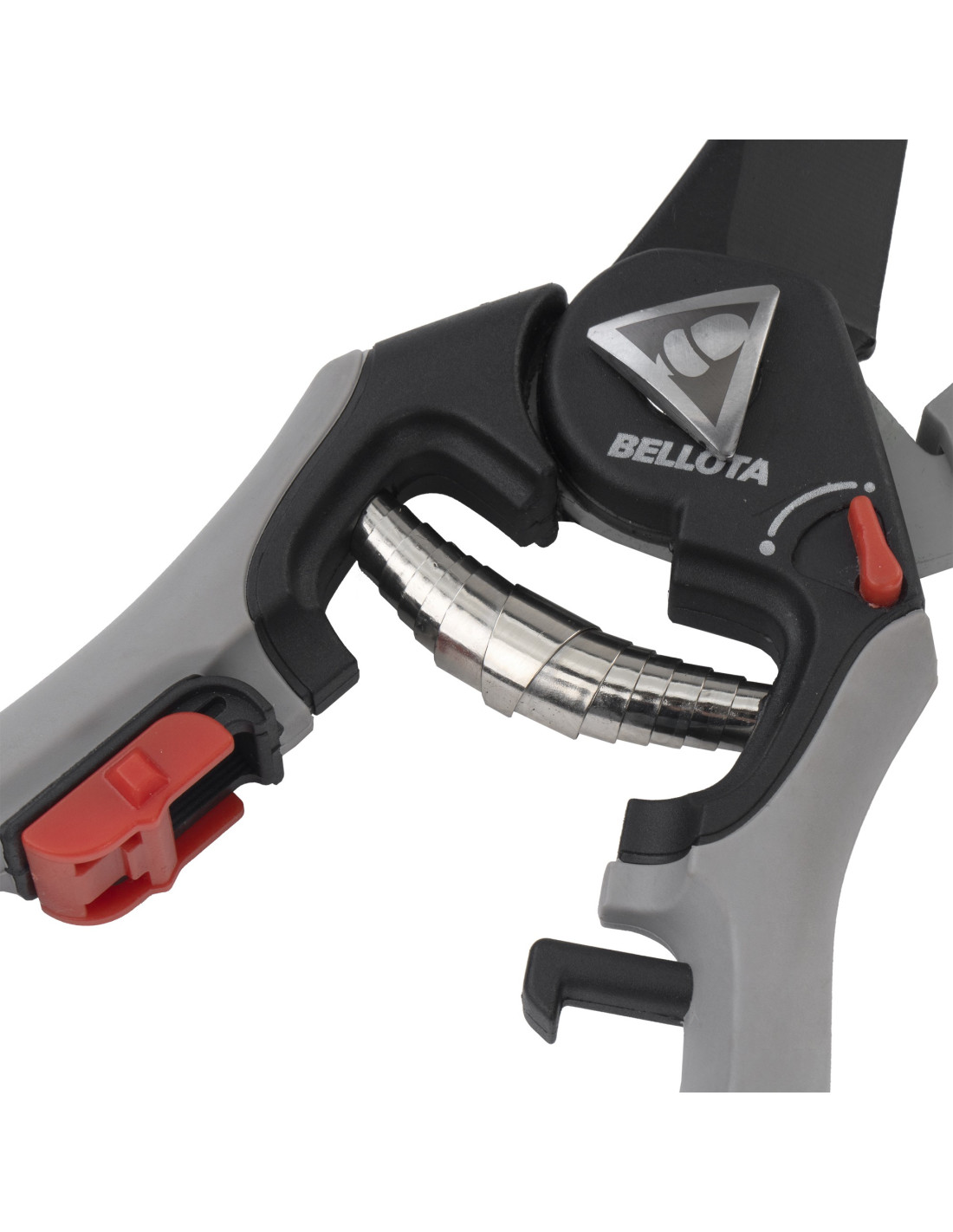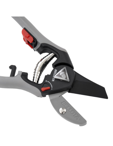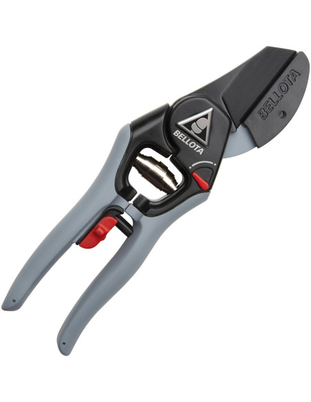 Tijera de jardín de una mano corte yunque para madera dura o seca, hojas recubiertas antiadherente para un corte limpio, diámetro de corte 28mm. Mangos Soft touch con sistema de apertura regulable. Seguro accionable por los dos lados.