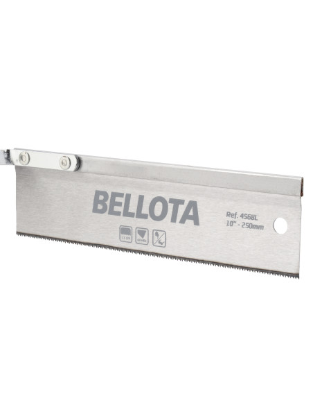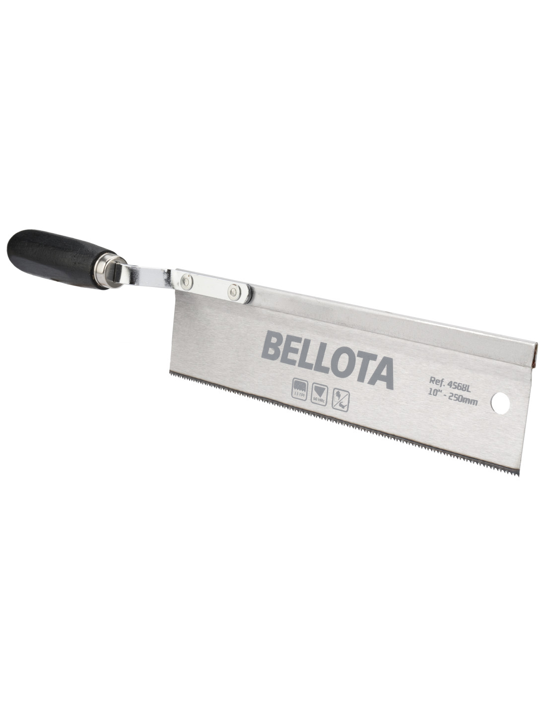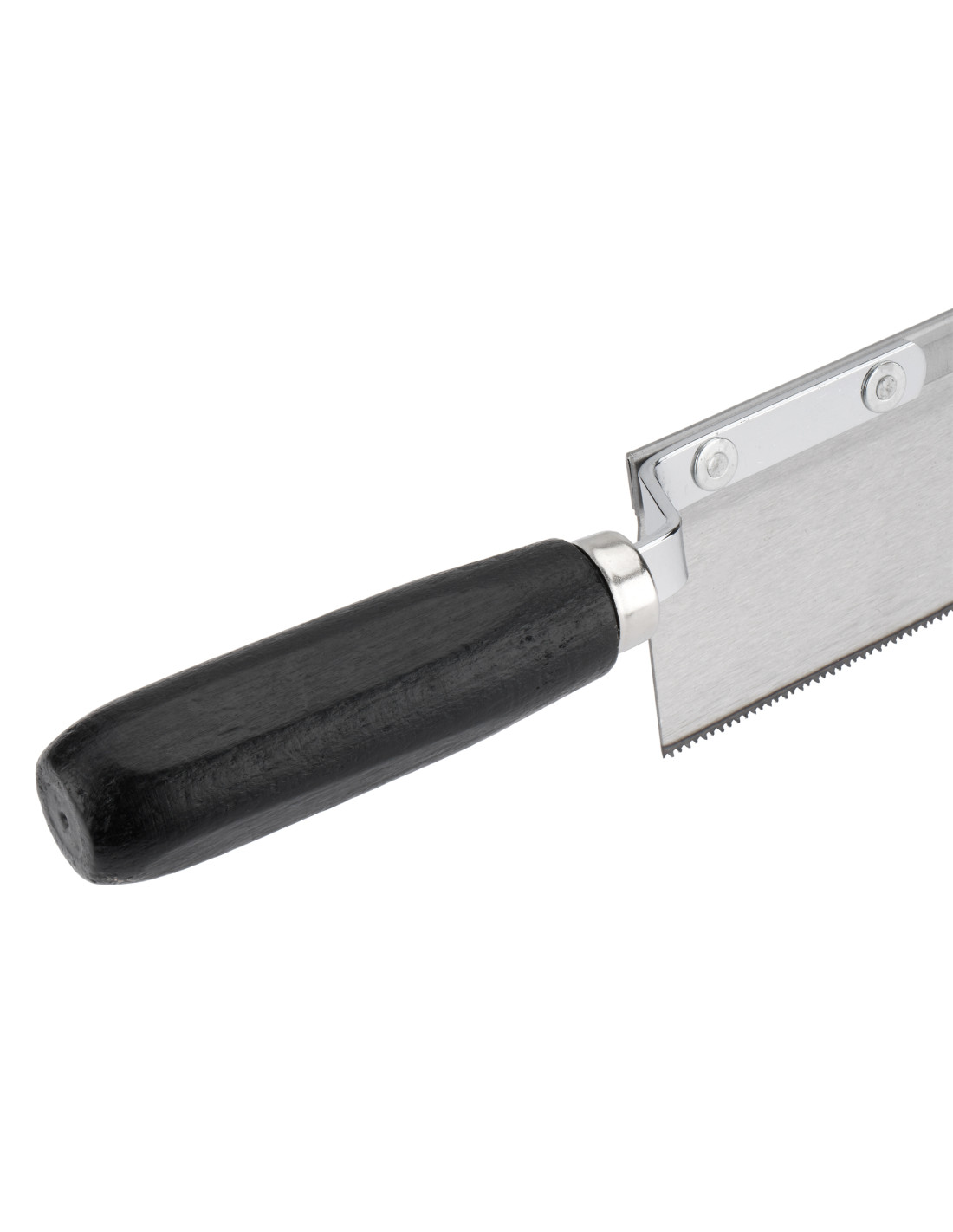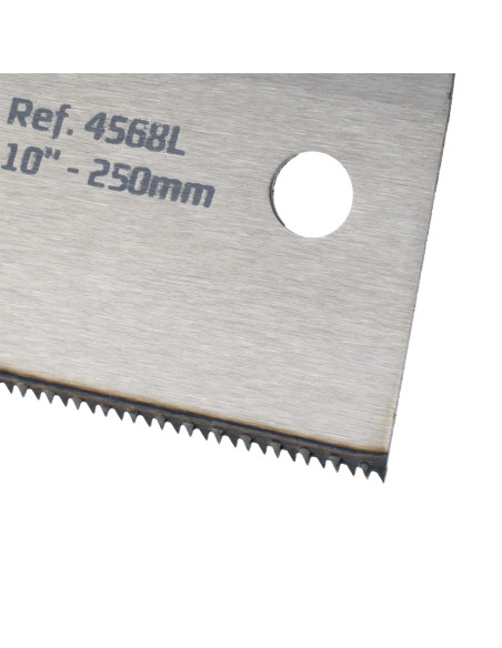 Serrucho de ebanista profesional con dentado muy fino de doble filo (13 TPI), con doble tratamiento térmico para un mayor rendimiento y máxima duración. Mango curvo de madera.