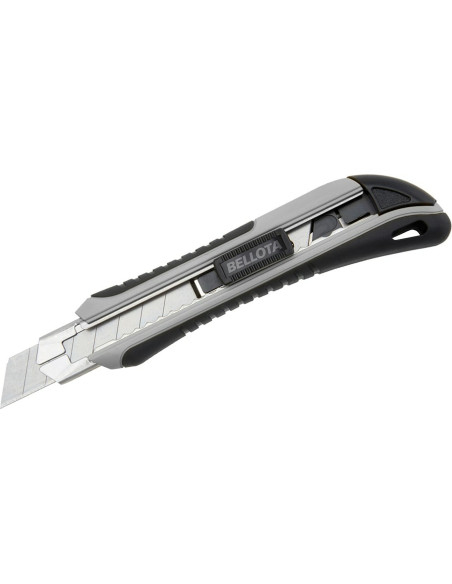 Cutter bimaterial de 18 mm con carcasa de aluminio y elastómero, incluye 6 cuchillas de acero al carbono de alta calidad tratadas térmicamente con recubrimiento de Titatnio para una máxima duración.