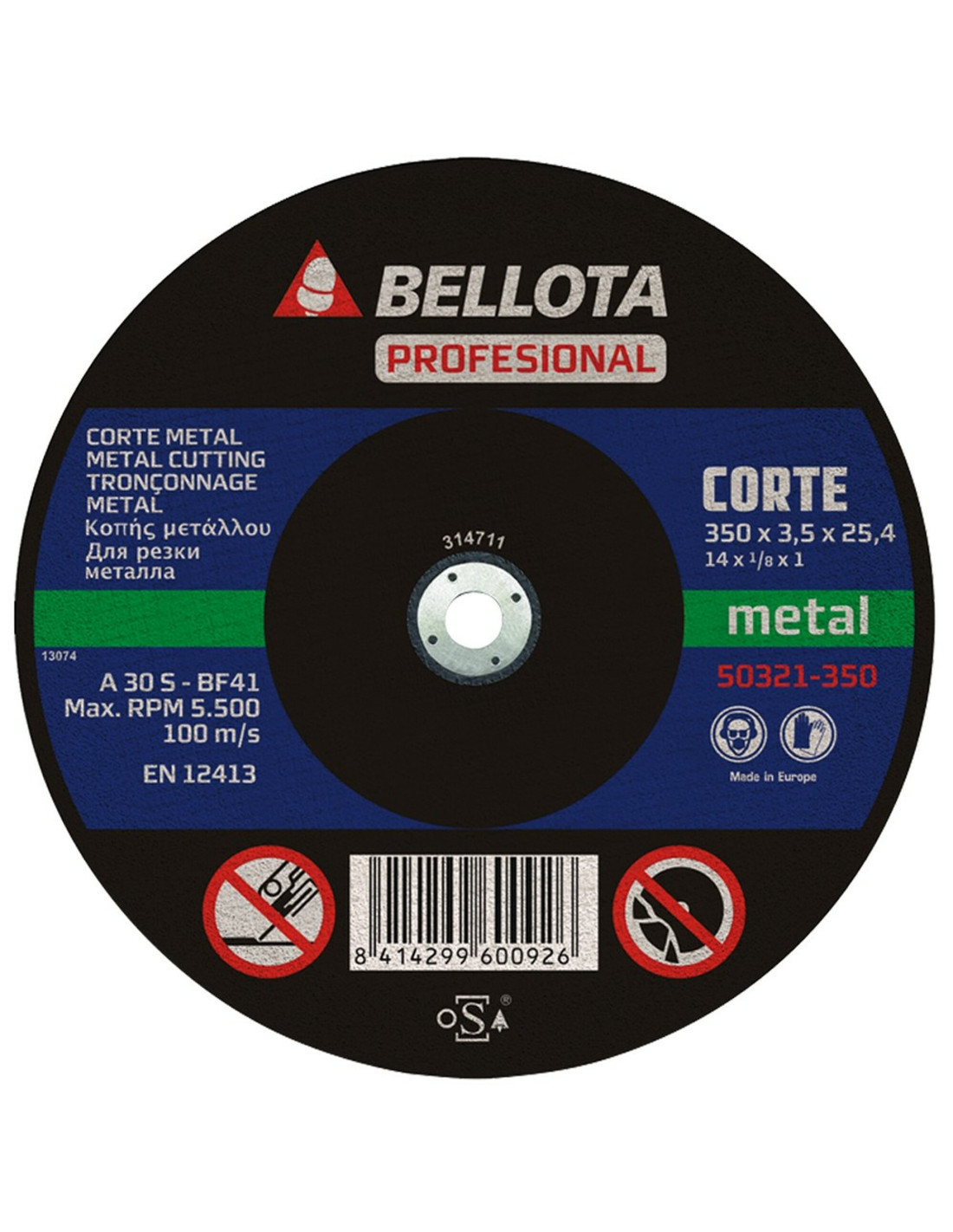 Disco abrasivo profesional para metal, espesor de 3,5 mm para un corte recto y seguro. Cumplen norma UNE EN 12413 de seguridad. Uso en máquinas esacionarias o cortadoras a gasolina portátiles.