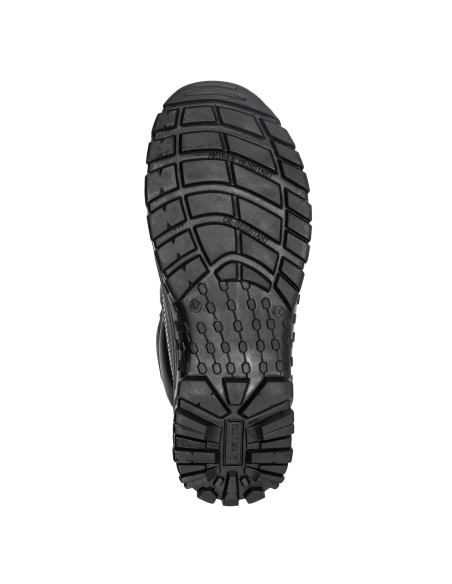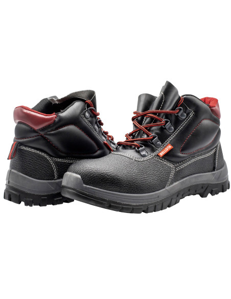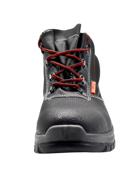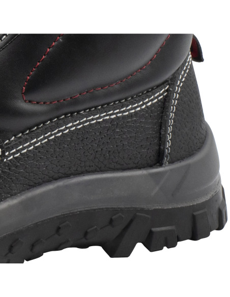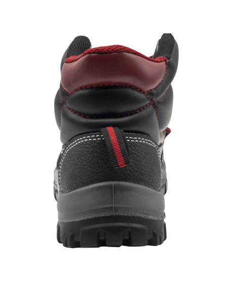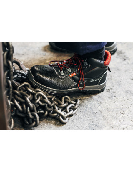 Bota de seguridad S3 en piel hidrófuga negra con detalles rojos y elementos de protección metálicos.