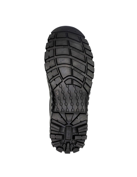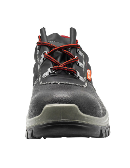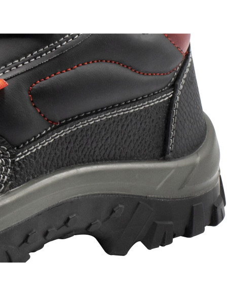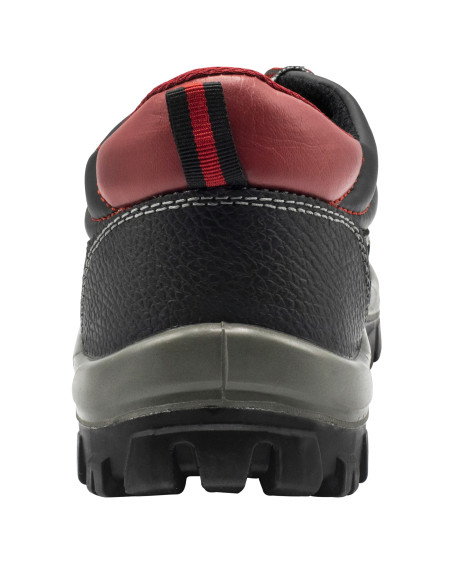 Zapato de seguridad S3 en piel hidrófuga negra con detalles rojos y elementos de protección metálicos.