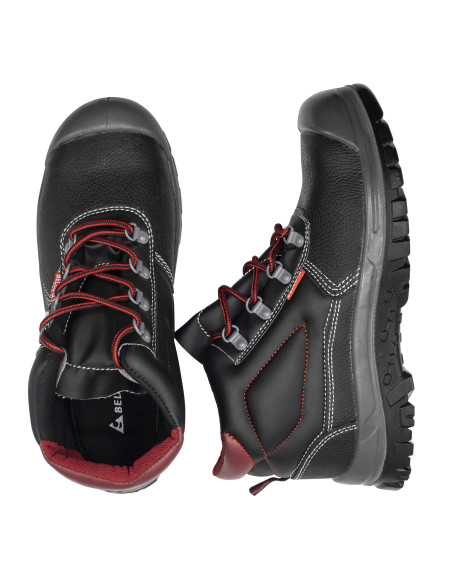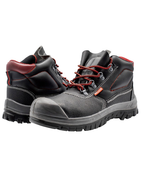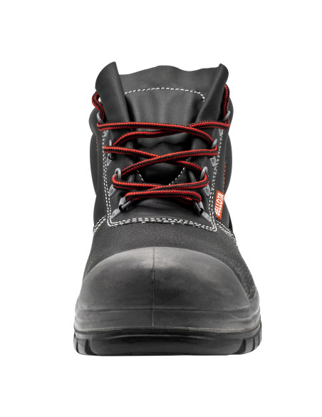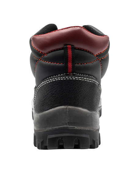 Bota de seguridad S3 en piel hidrófuga negra con puntera reforzada, detalles rojos y elementos de protección metálicos.