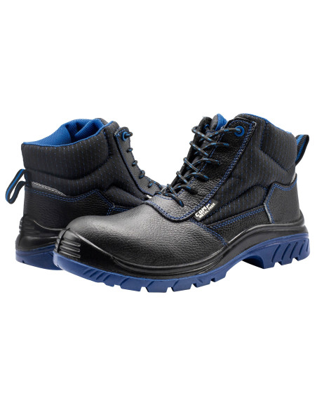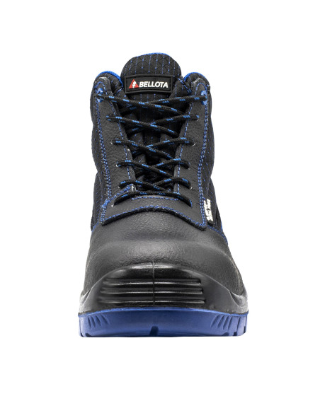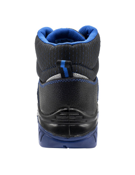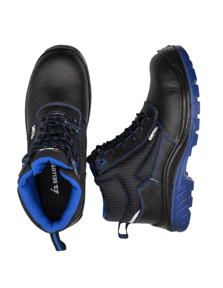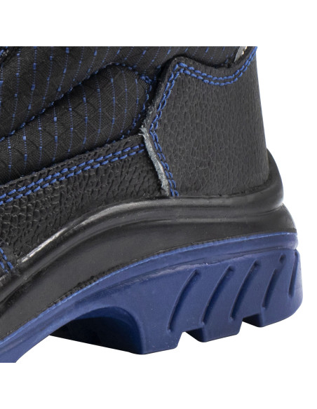 Bota de seguridad S3 en piel hidrófuga negra con detalles azules y elementos de seguridad no metálicos.
