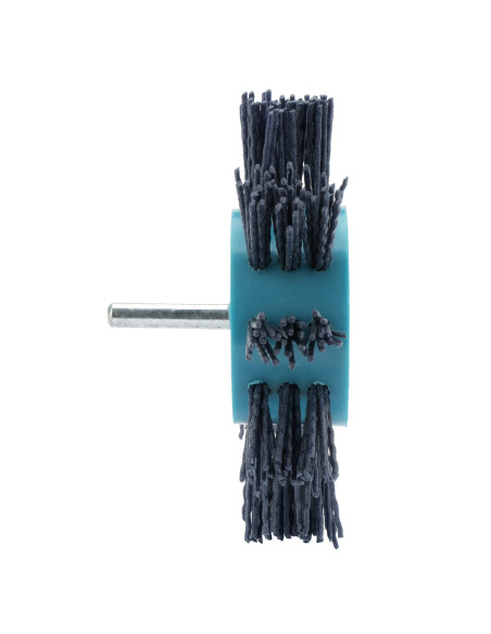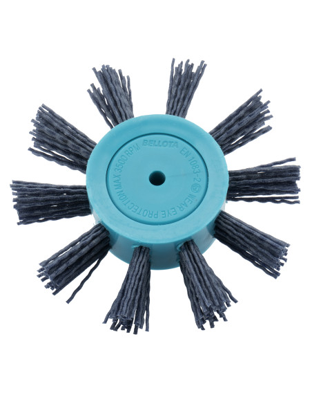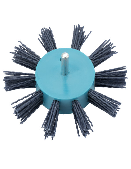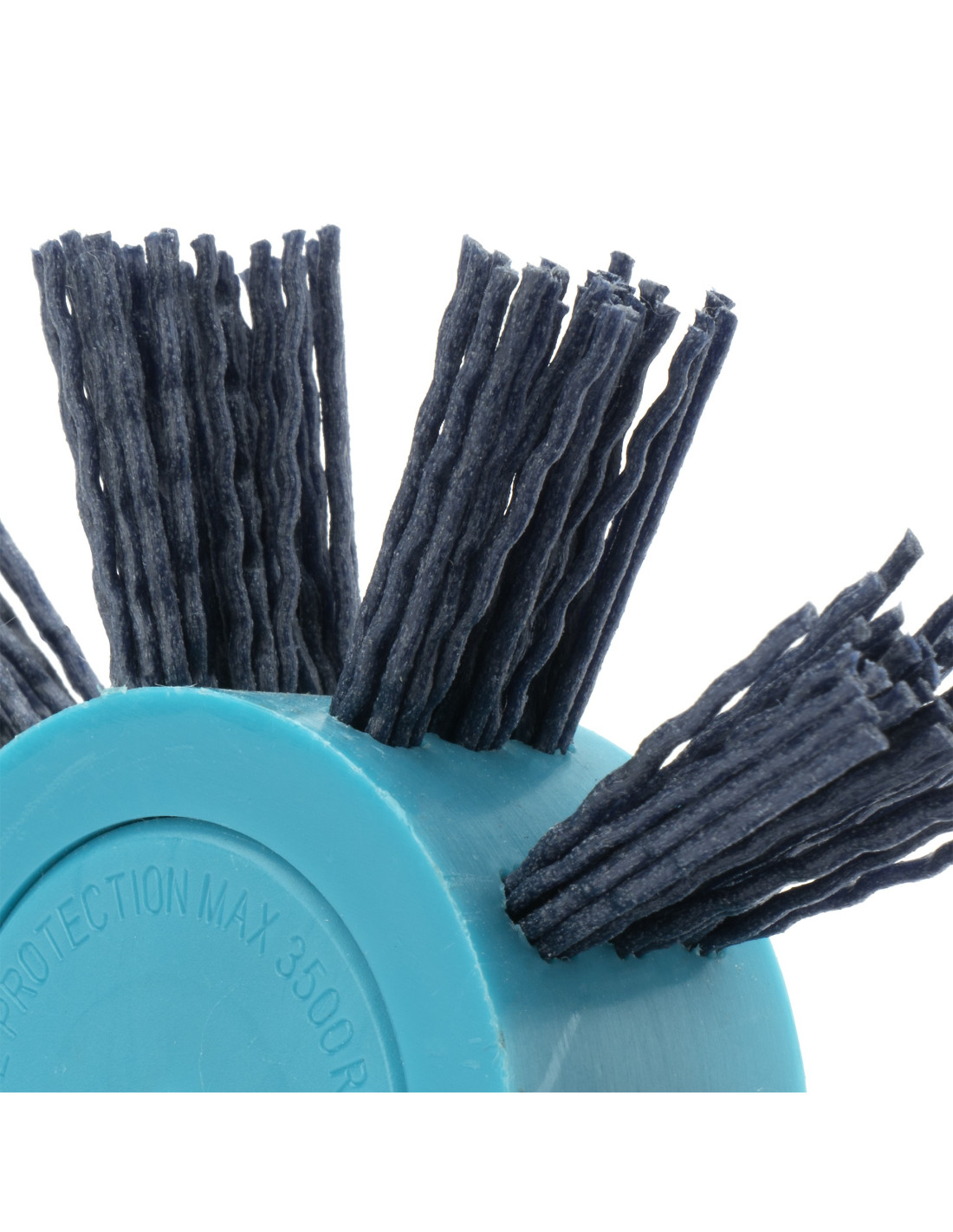 Cepillo abanico con hilo de nylon y abrasivo de carburo de silicio (Azul: grano 180, acabado fino). Con perno de 6 mm para uso en taladros de un máximo de 4.500 rpm.
