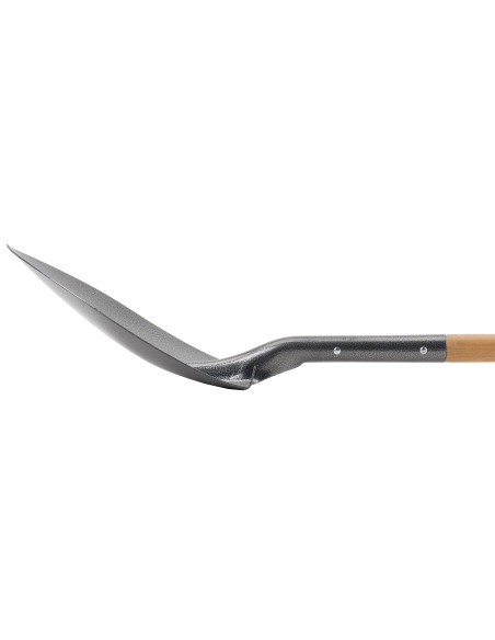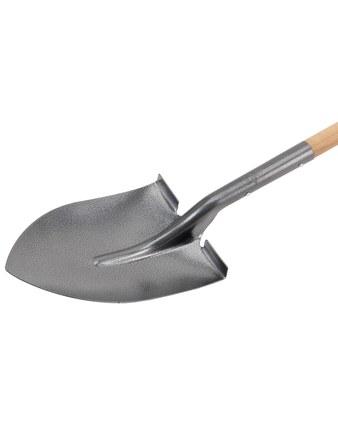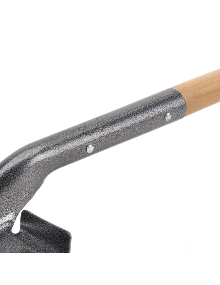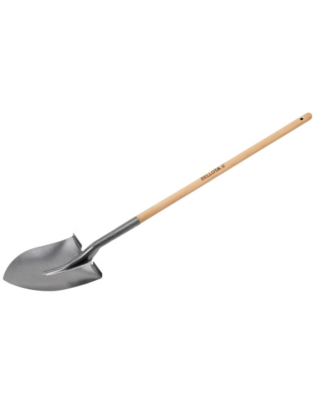 Pala punta profesional de chapa de acero tratado, mango largo de madera y unión perfecta sin rebabas.