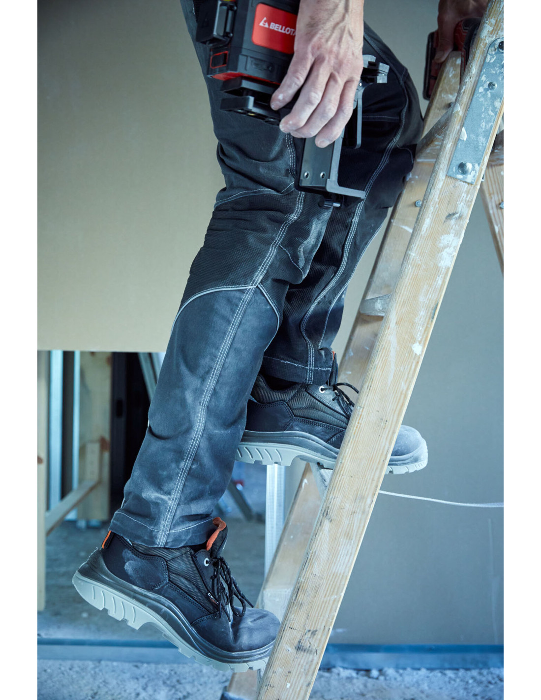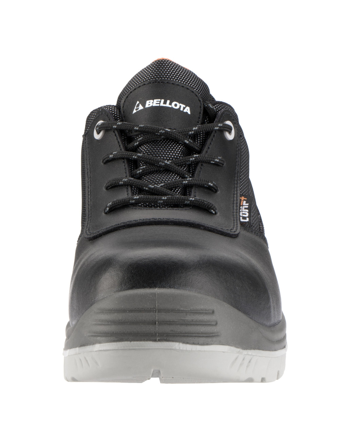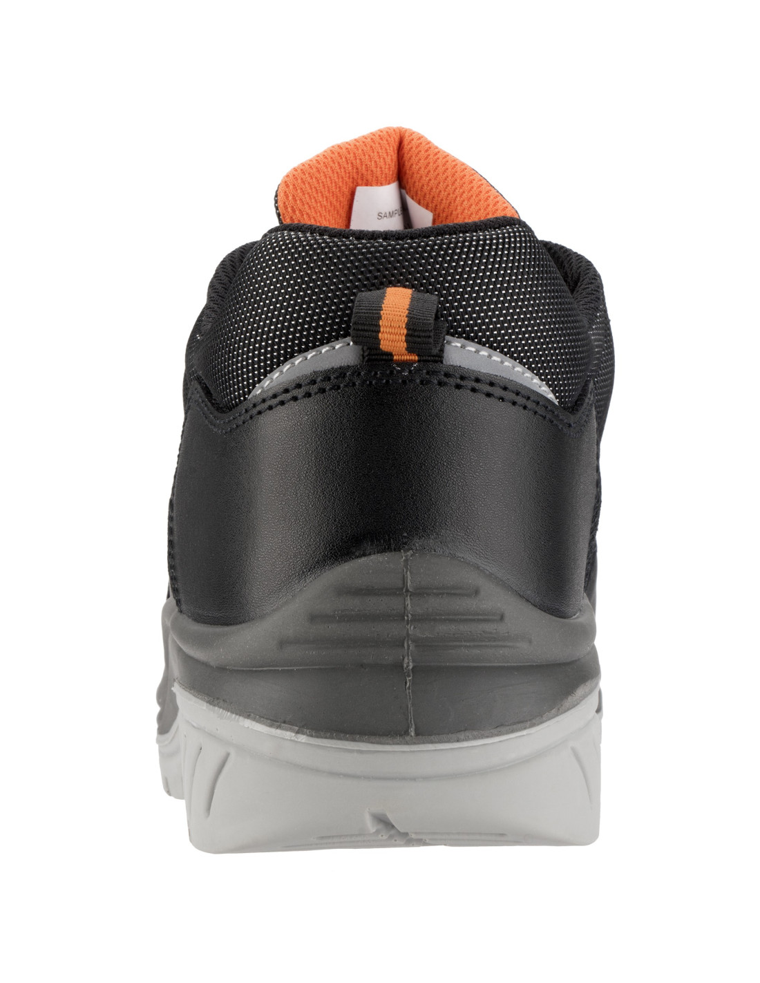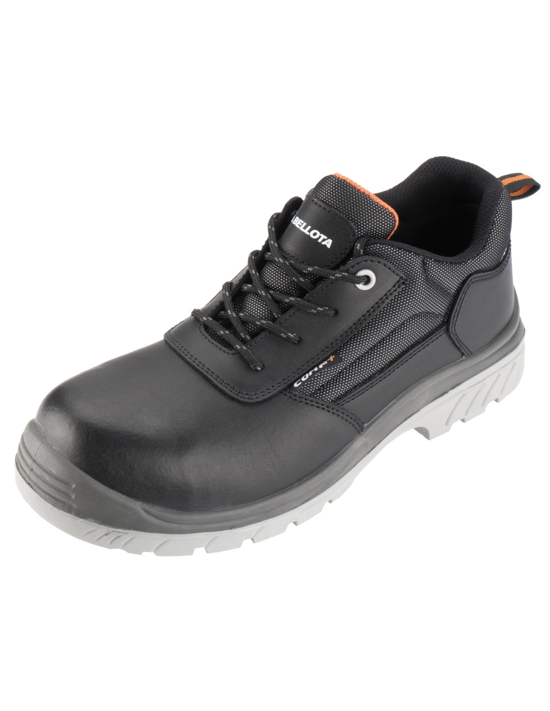 Zapato de seguridad S3 en piel hidrófuga negra con detalles naranjas y elementos de seguridad no metálicos.