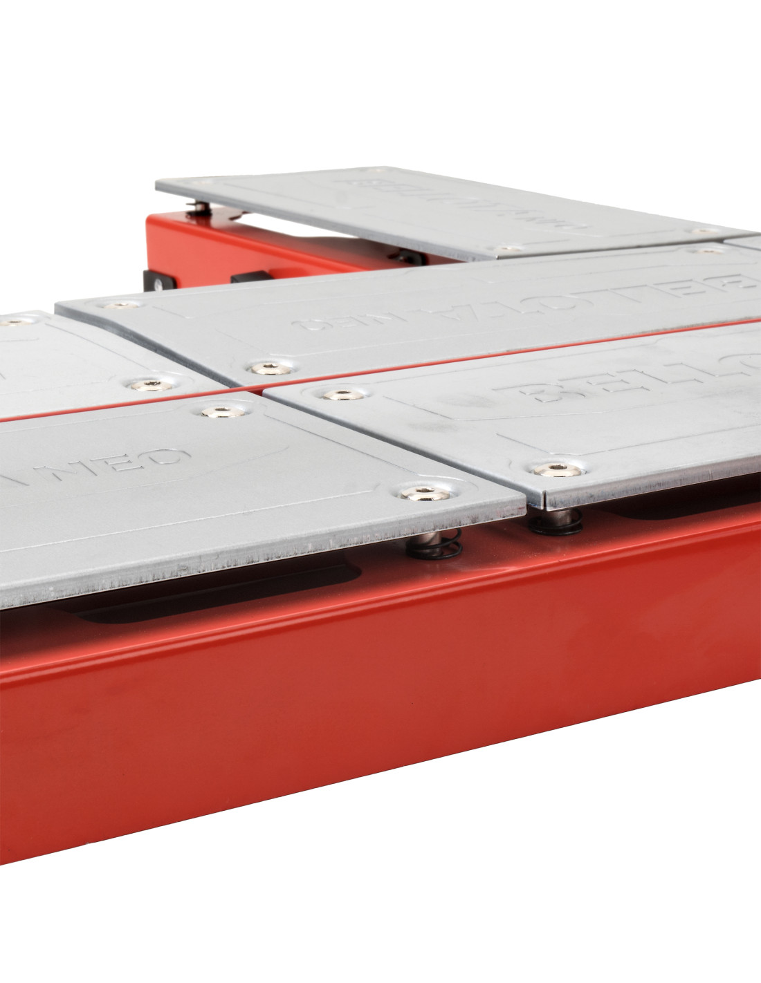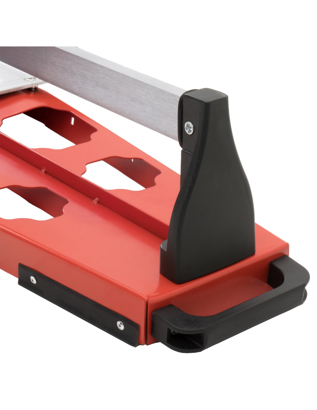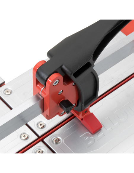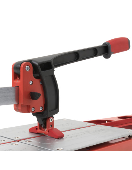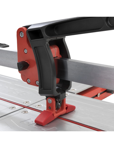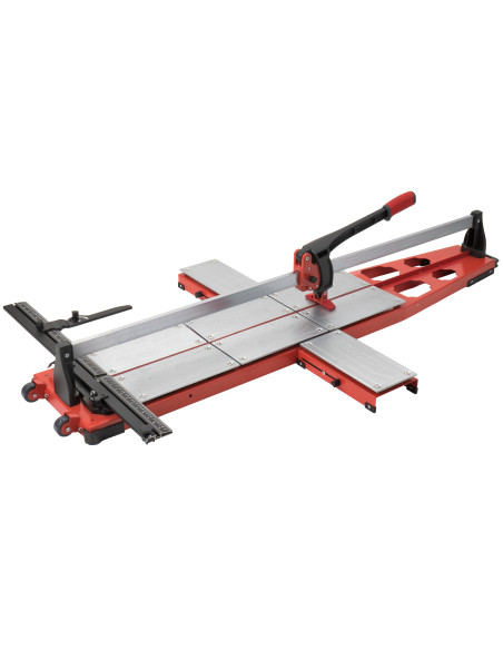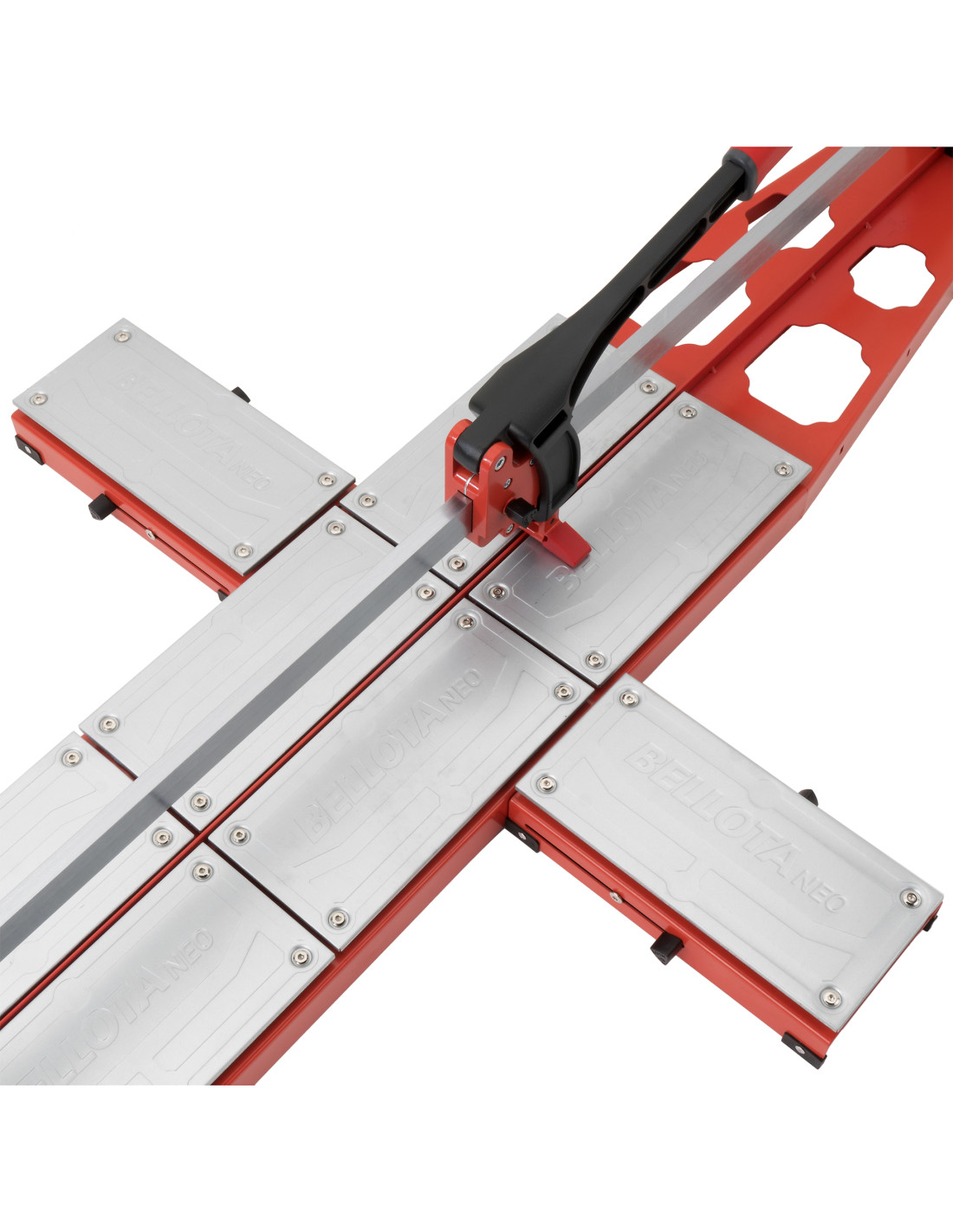 Cortadora de cerámica profesional de gran formato Neo130, 1300 mm de corte, máximo espesor de 18 mm, 1200 Kg de fuerza separación, incluye escuadra-trolley y rulina de 22 mm. Estructura monoguía robusta y precisa con un potente sistema de separación. Rayado con solo 2 kg de fuerza. Para el alicatador profesional más exigente.