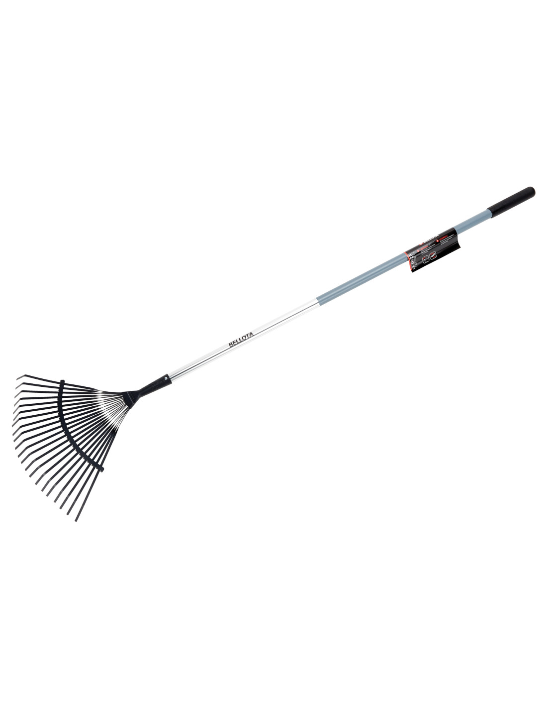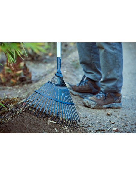 Escoba de jardín con púa plana templada térmicamente y con mango de aluminio.