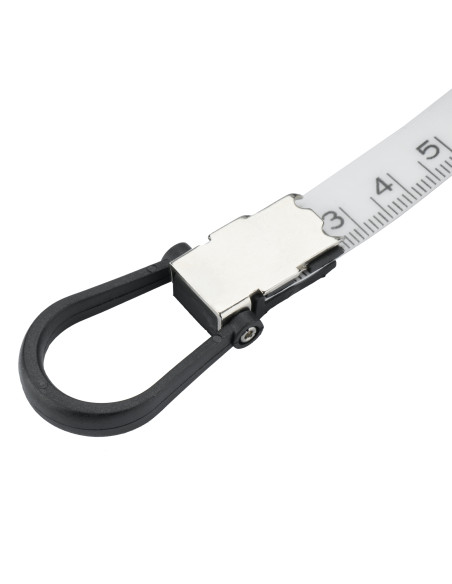 Cinta métrica de fibra de vidrio de 24 hilos con graduación milimétrica por los dos lados, máxima duración y resistencia, flexible y lavable. Gancho de acero con forma abatible. Carcasa de plástico.