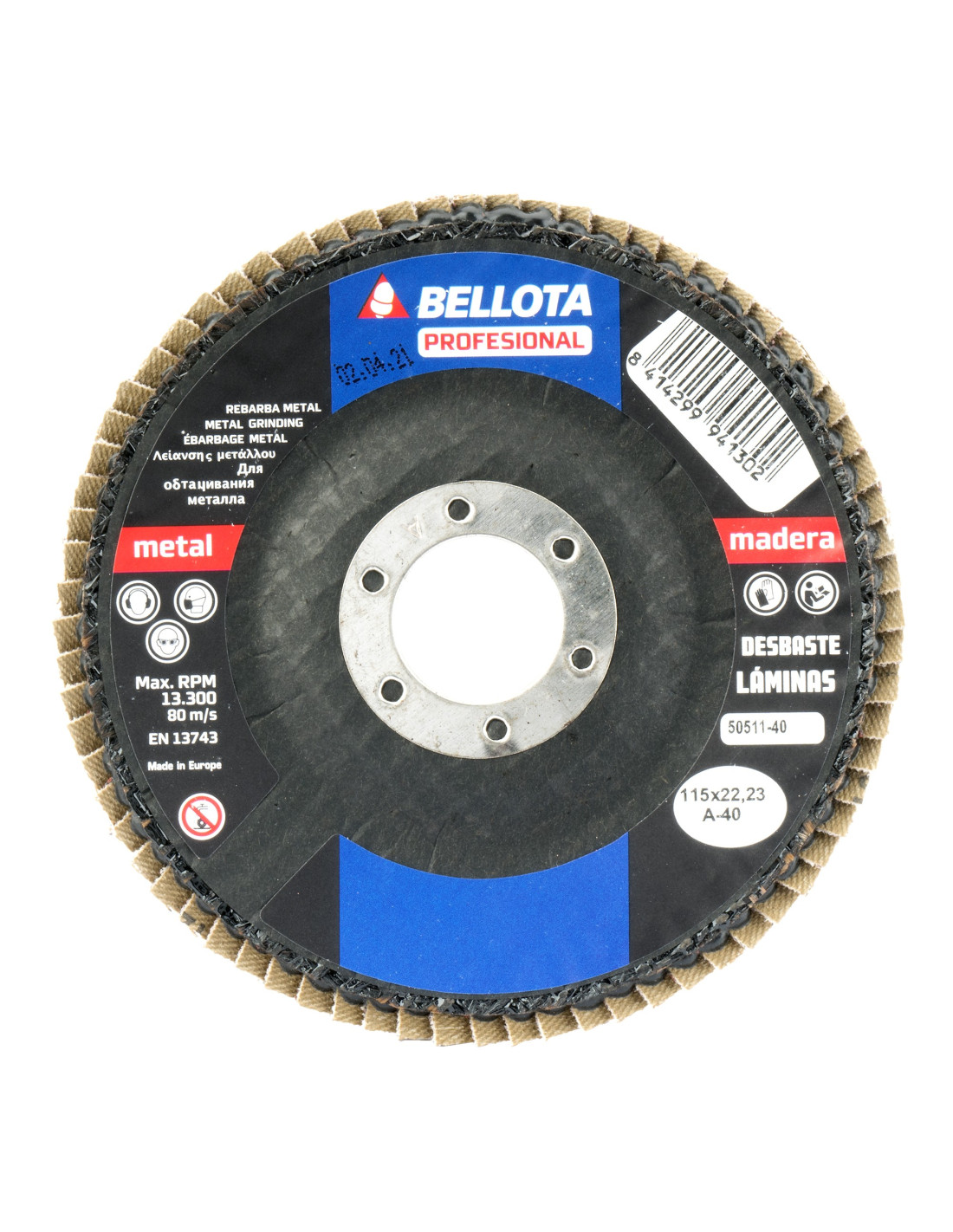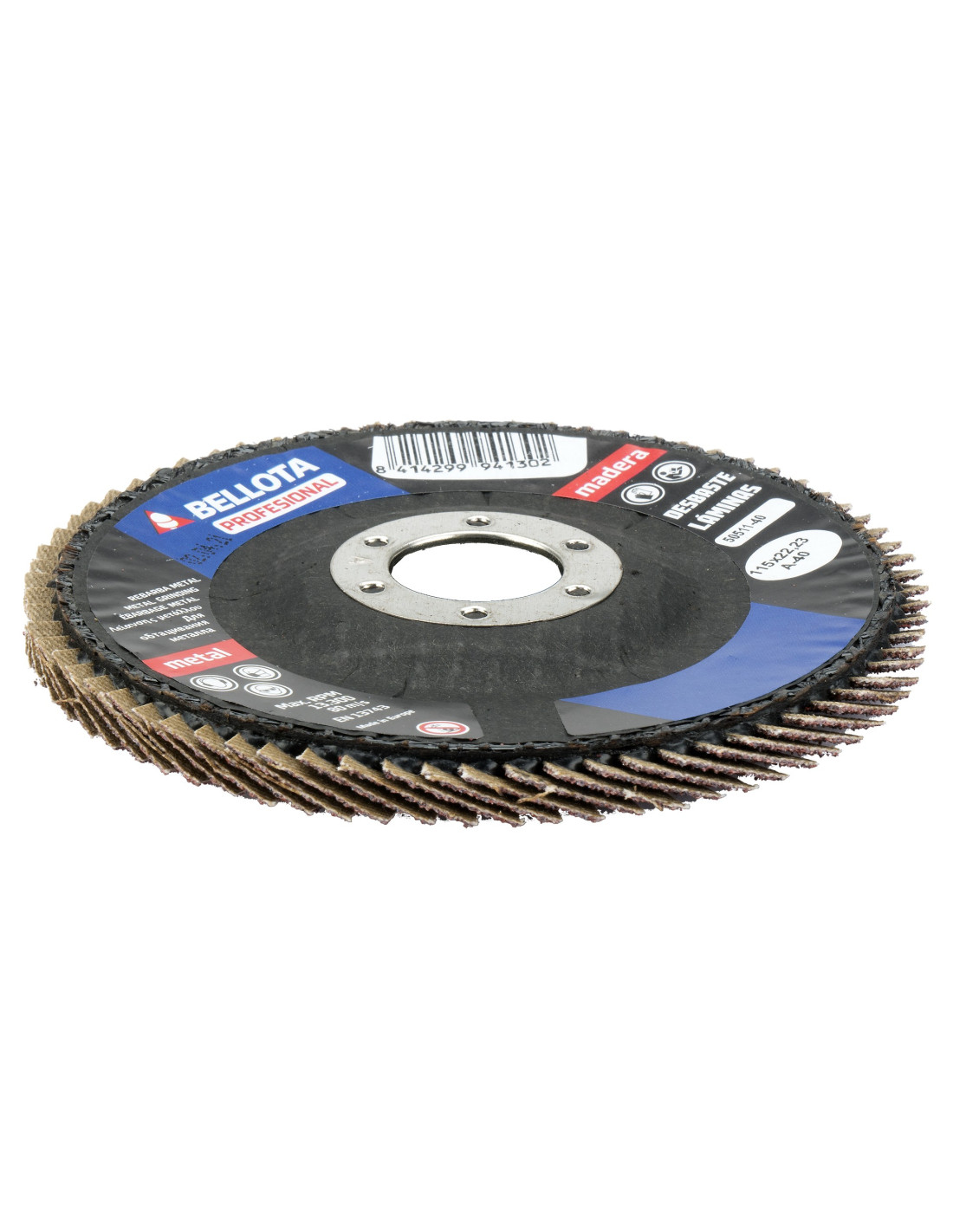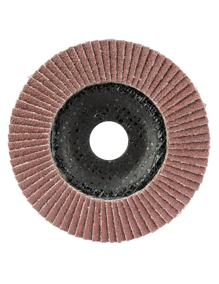 Disco de láminas con base cóncava de fibra de vidrio para desbaste de madera-metal, grano abrasivo A (óxido de alumina - corindón). Cumplen norma UNE EN 13743 de seguridad.