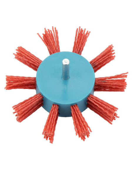 Cepillo abanico con hilo de nylon y abrasivo de carburo de silicio (Rojo: grano 80, acabado basto). Con perno de 6 mm para uso en taladros de un máximo de 4.500 rpm.