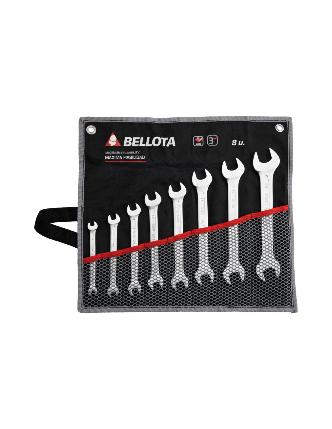 Juego bolsa de llaves fijas forjadas en acero CrV con acabado cromado mate. Par de apriete 50% superior a la norma. Cumplen DIN 3110 y DIN 475. Para trabajos de apriete y ajuste de tornillos.