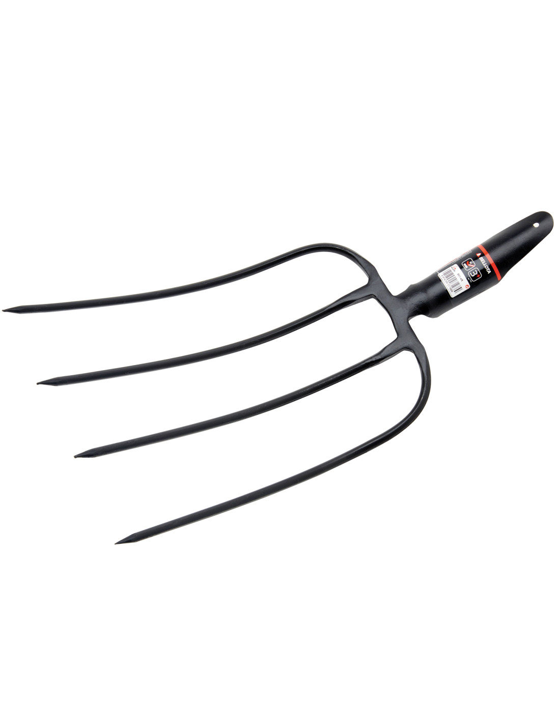 Horca de cuatro púas fabricada en acero especial y forjada en una sola pieza para recoger heno y estiércol. Cubo de enmangado reforzado para una perfecta unión.