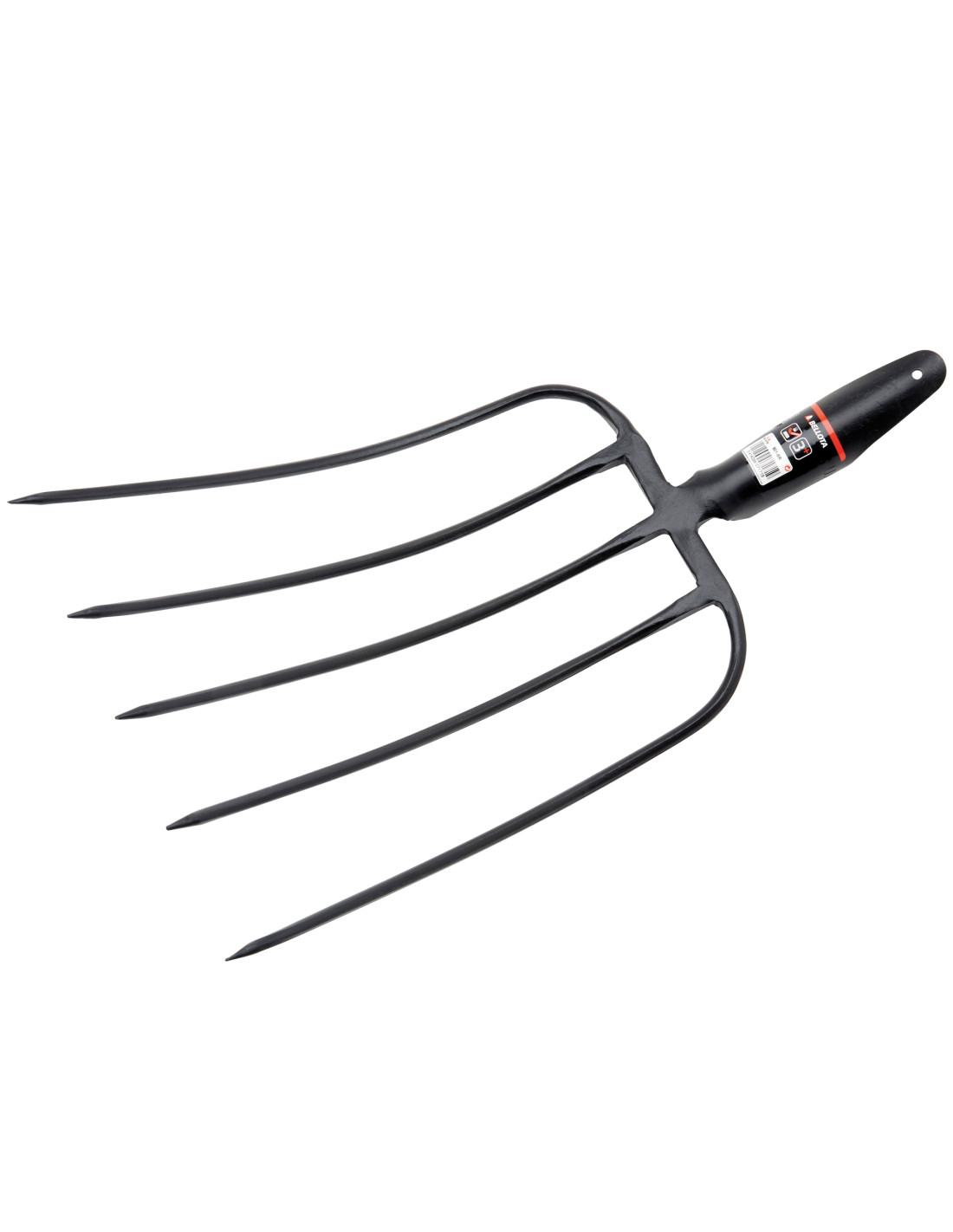 Horca de cinco púas fabricada en acero especial y forjada en una sola pieza para recoger heno y estiércol. Cubo de enmangado reforzado para una perfecta unión.