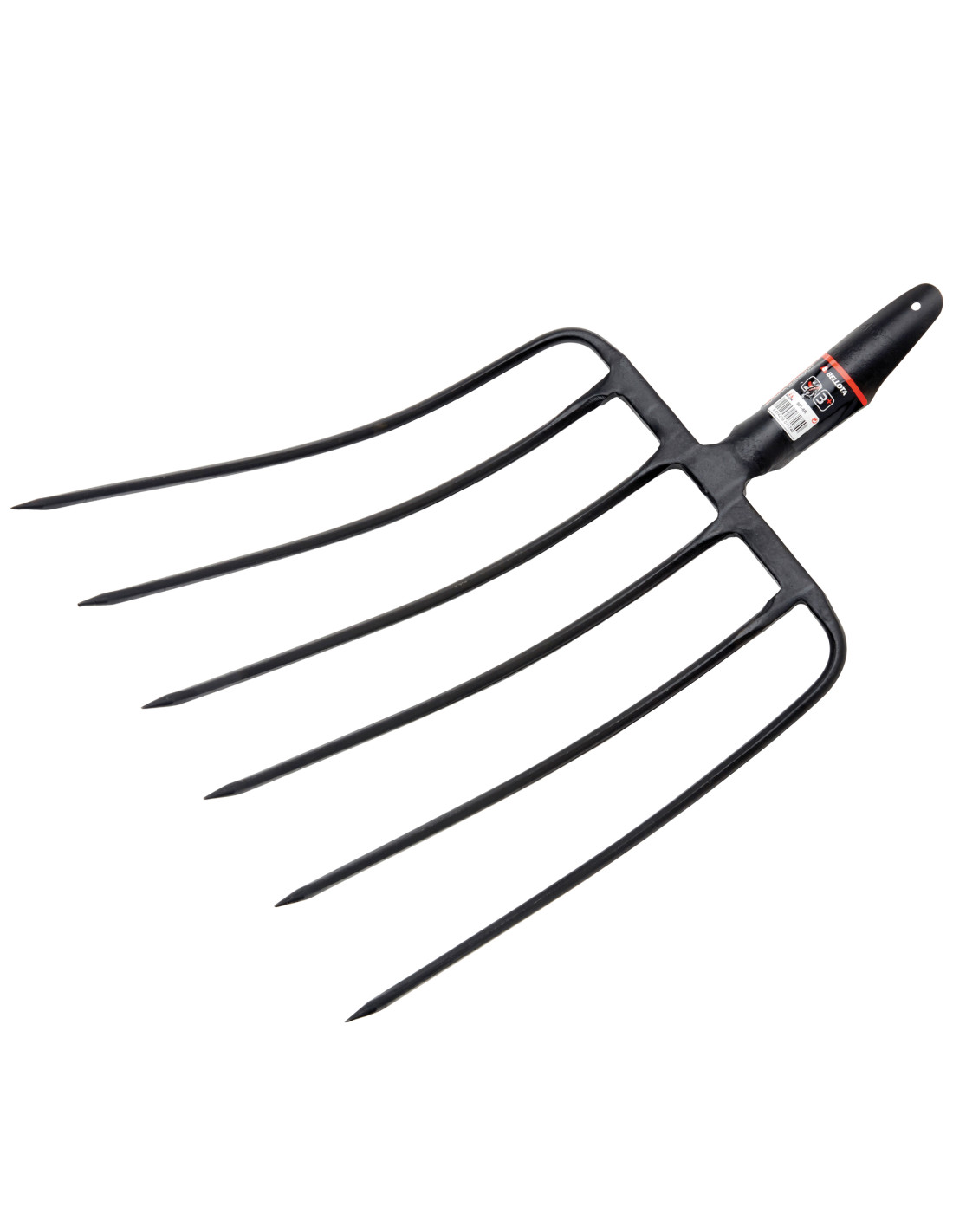 Horca de seis púas fabricada en acero especial y forjada en una sola pieza para recoger heno y estiércol. Cubo de enmangado reforzado para una perfecta unión.