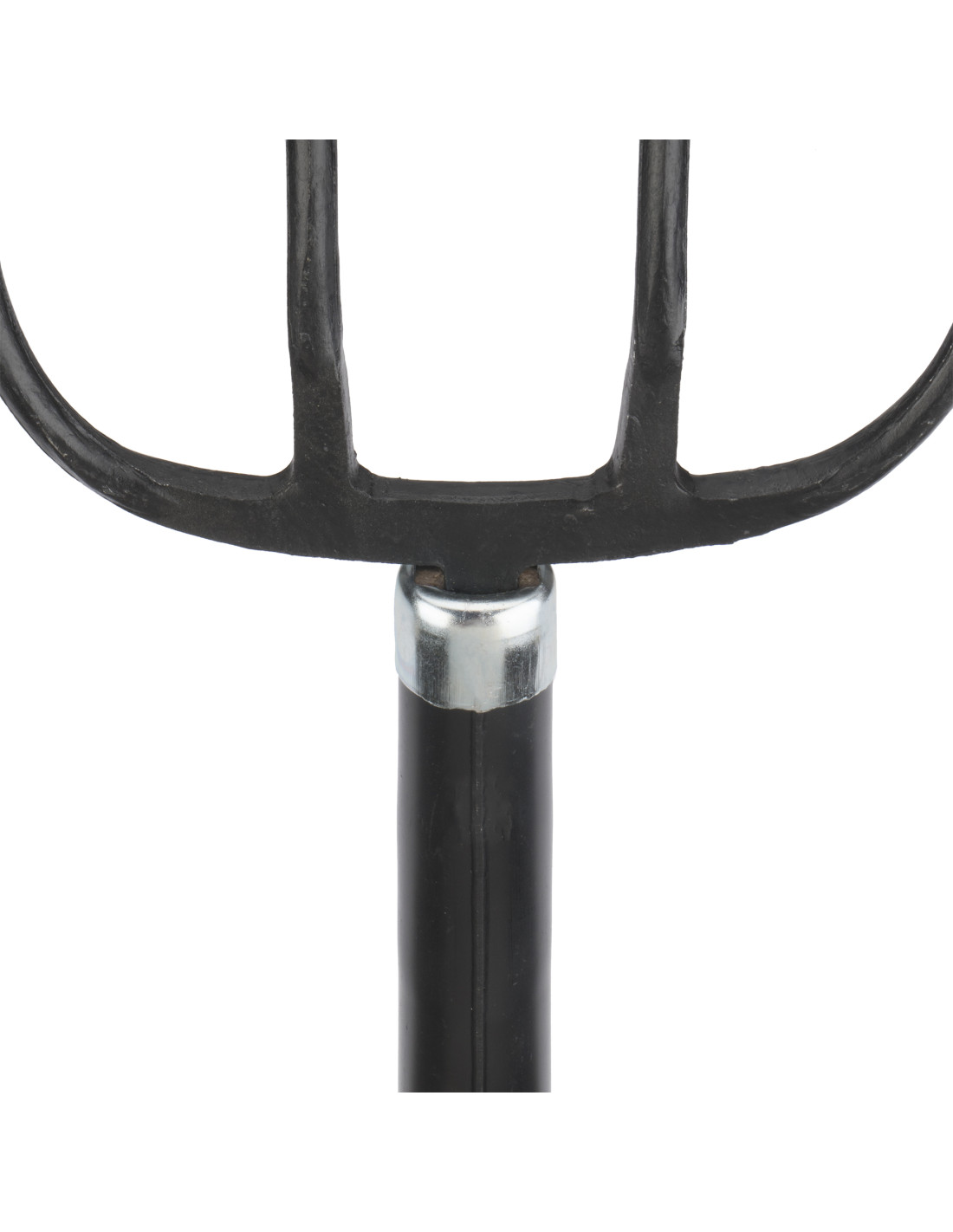 Horca de cuatro púas fabricada en acero especial y forjada en una sola pieza, para recoger heno y estiércol. Mango con anilla metálica, perfecta unión de cabeza y mango mediante virola.