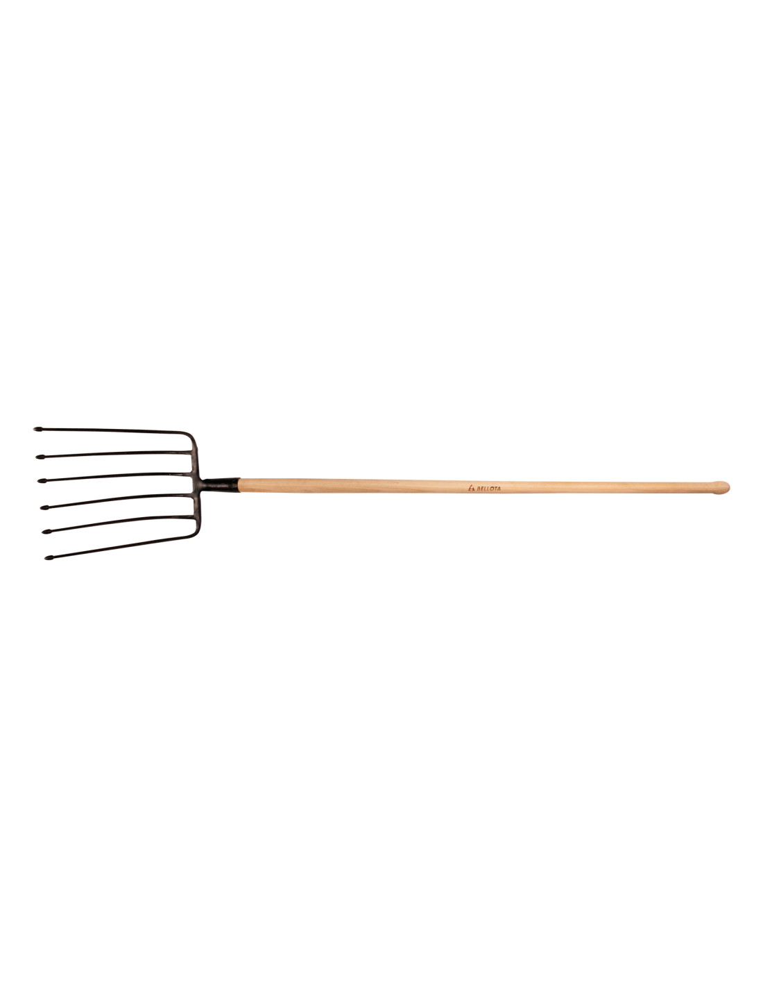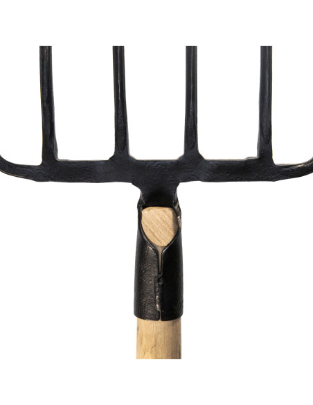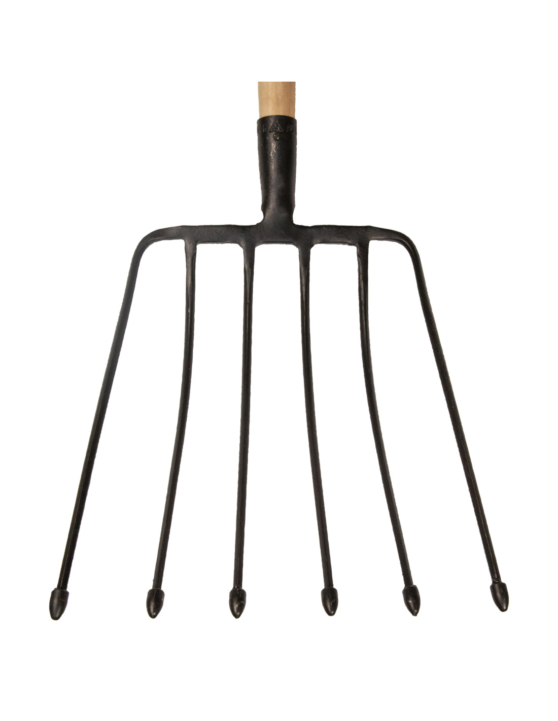 Horca forjada de seis púas fabricada en acero especial y forjada en una sola pieza para trabajar terrenos de piedra y grava. Puntas redondeadas para que no se claven en el terreno al recoger el mater