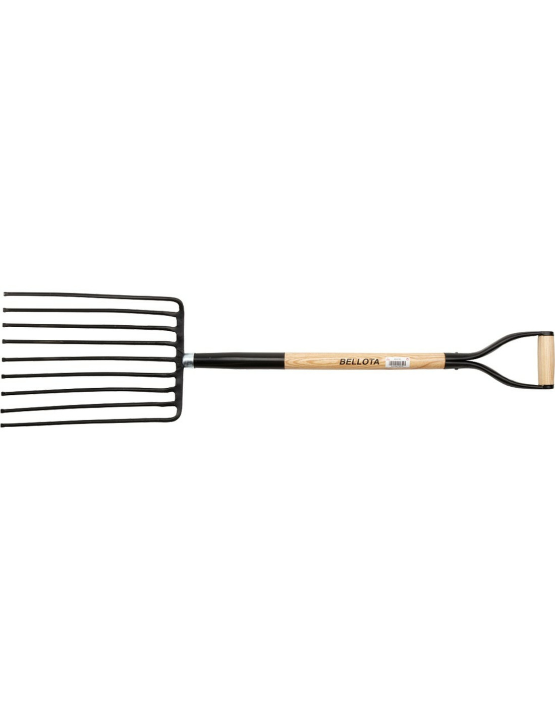 Horca forjada de nueve púas fabricada en acero especial y forjada en una sola pieza para trabajar terrenos de piedra y grava. Puntas redondeadas para que no se claven en el terreno al recoger el mate