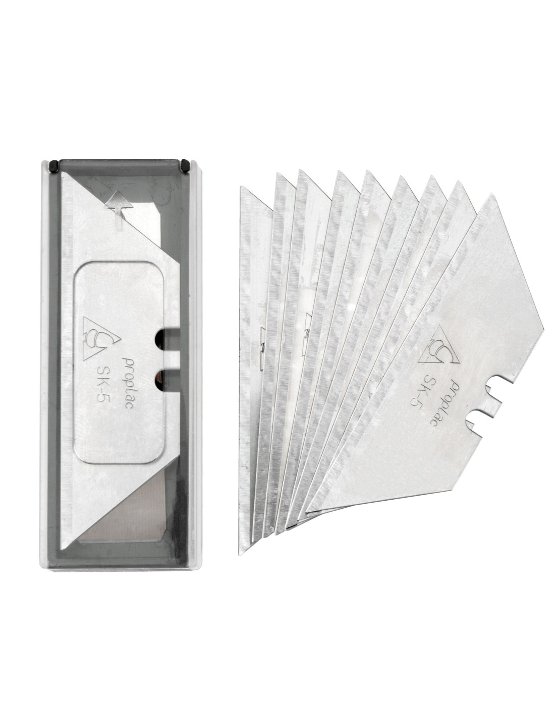 Hojas trapezoidales reversibles de 19 mm de recambio para cutter, de acero al carbono de alta calidad tratadas térmicamente para una máxima duración. Estuche de 5 unidades.