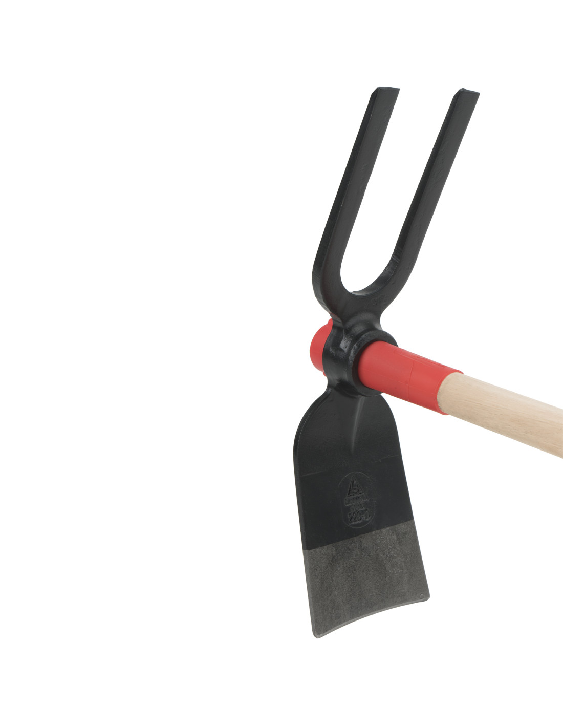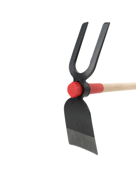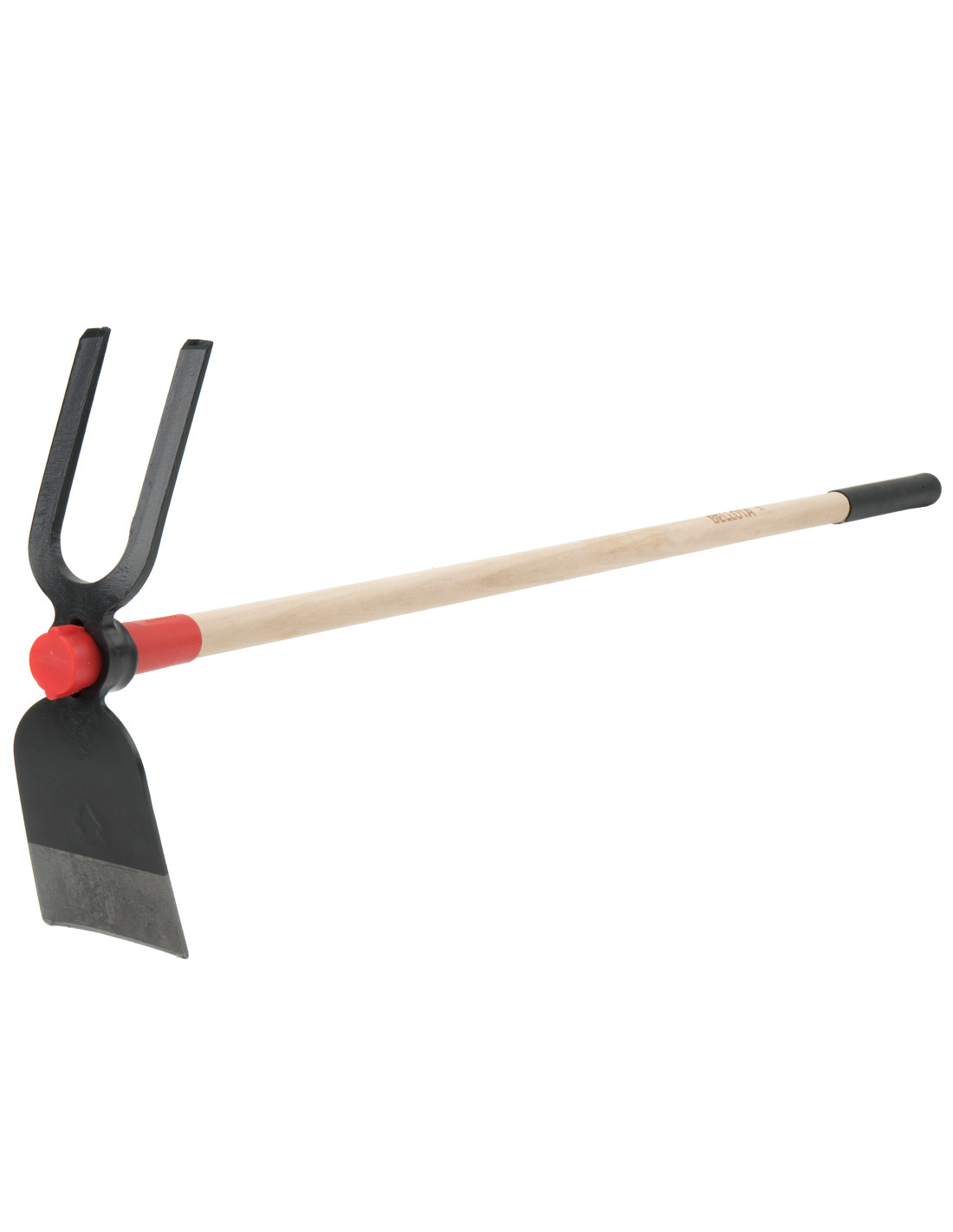 Azada forjada con sistema antigiro y de doble figura: azada y horquilla, con mango de madera que procede de bosques gestionados de forma sostenible y fuentes controladas (PEFC/14-35-00020), especial p