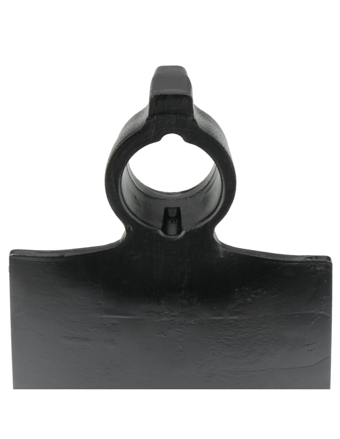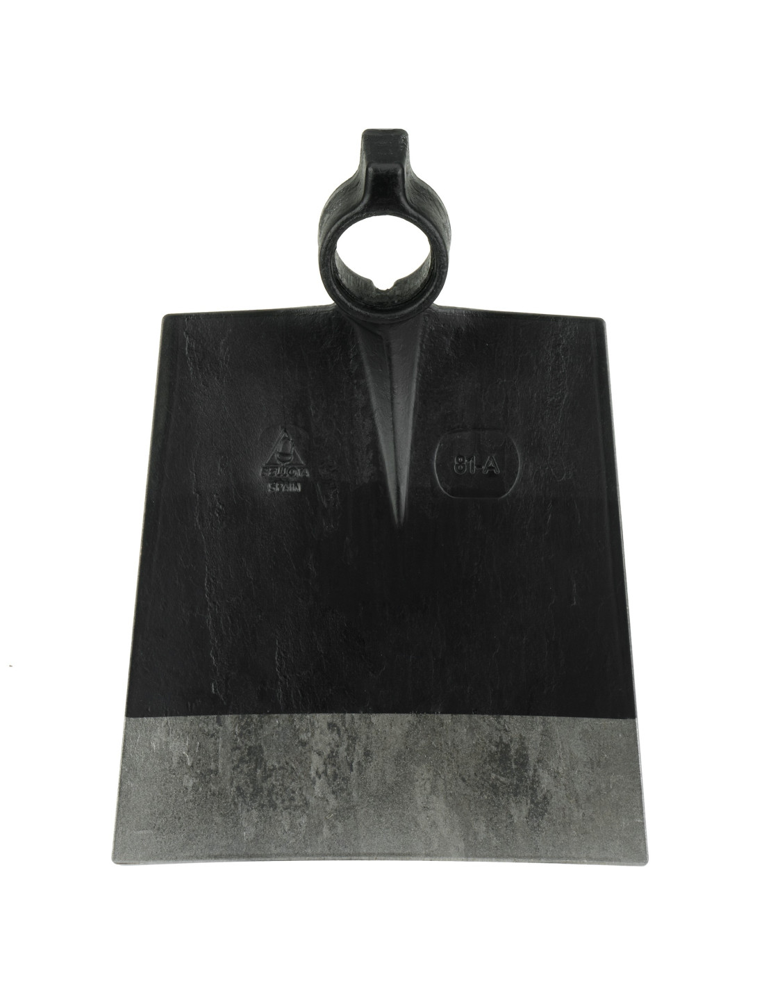 Azada forjada con sistema antigiro cuadrada, con filo cuadrado, hombros rectos y martillo en el ojo.