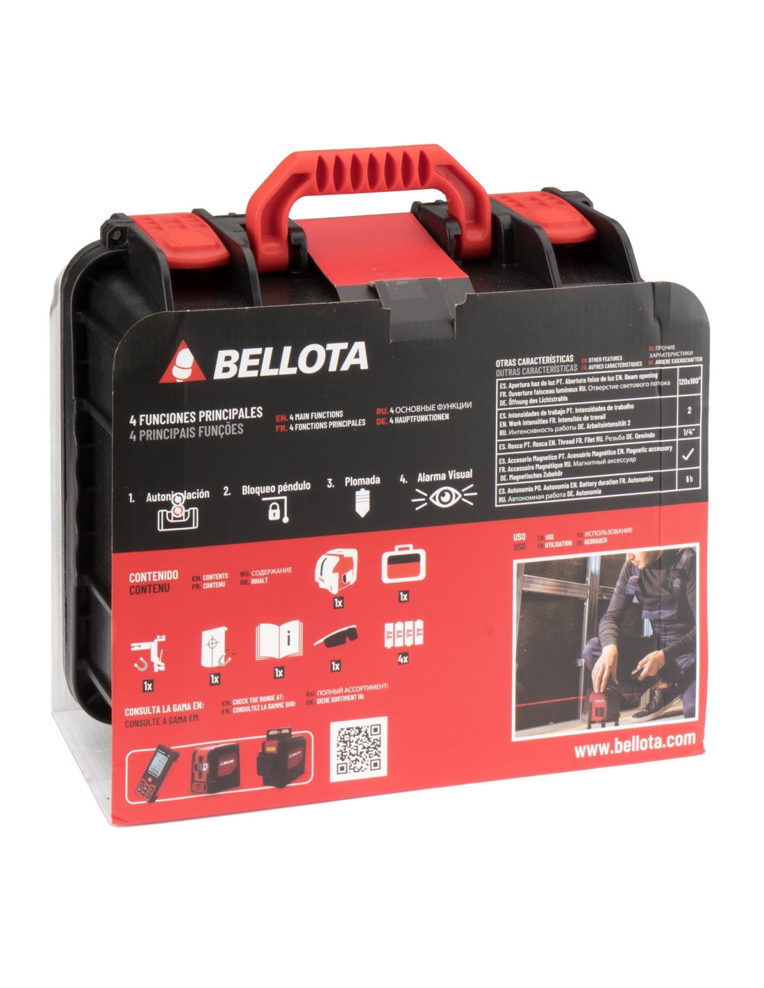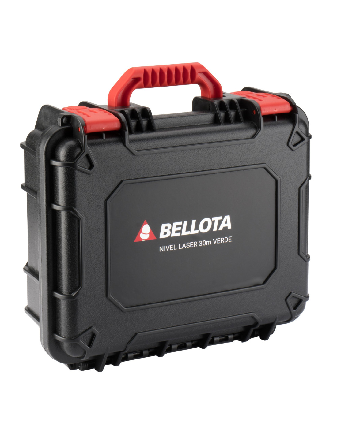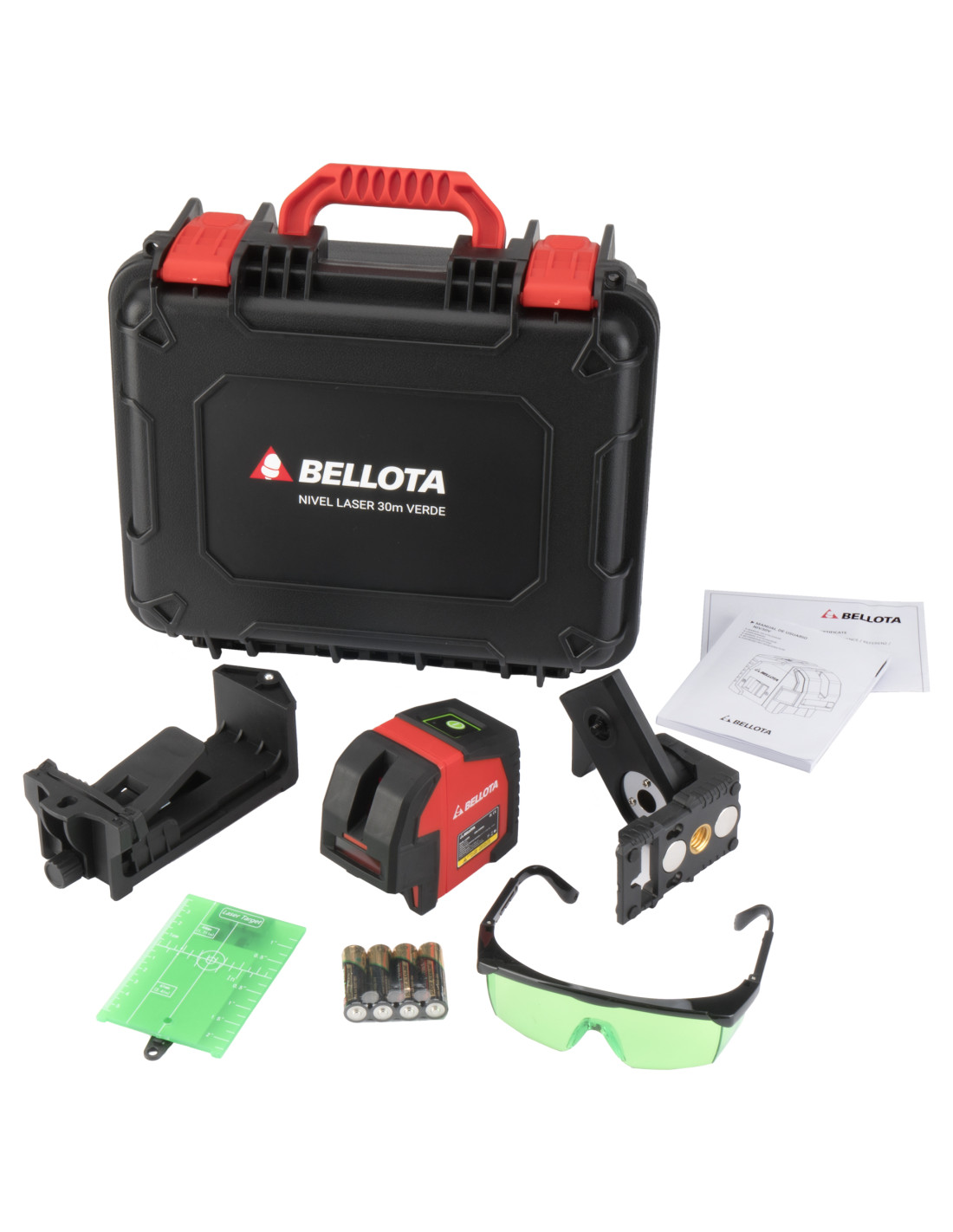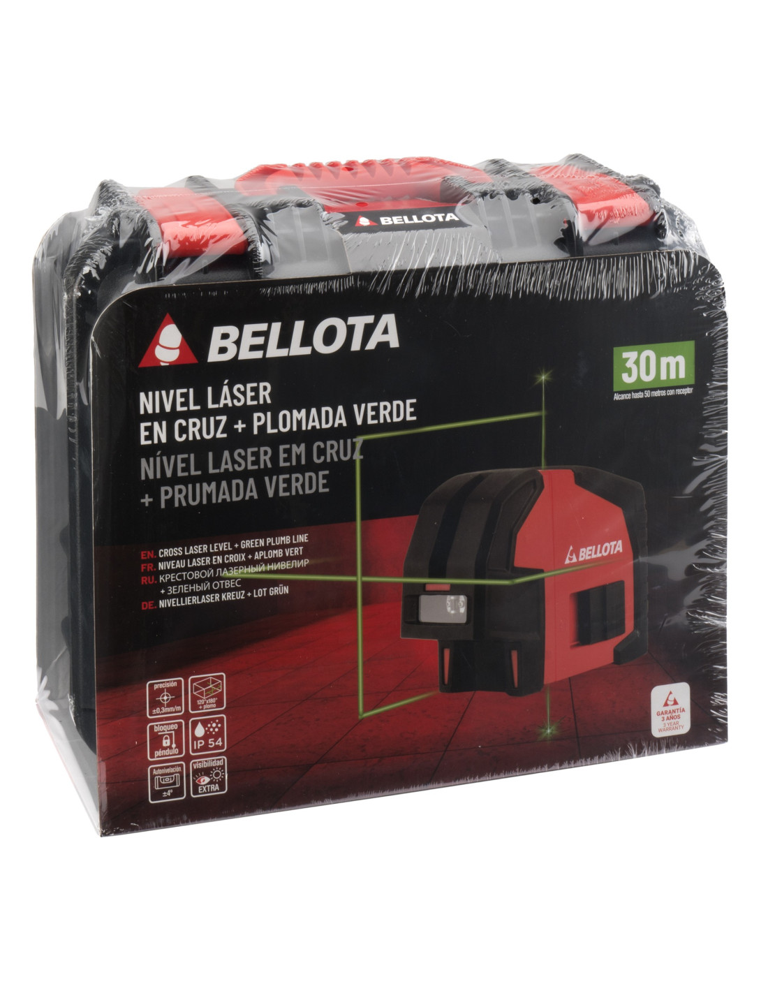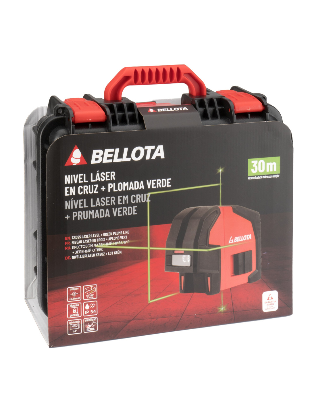 Nivel láser en cruz de 30 metros de alcance con plomada, autonivelante con precisión 0,3 mm/m, IP54 y bloqueo de péndulo. Incluye maleta, soporte magnético+pinza, gafas, placa reflectora magnética y p