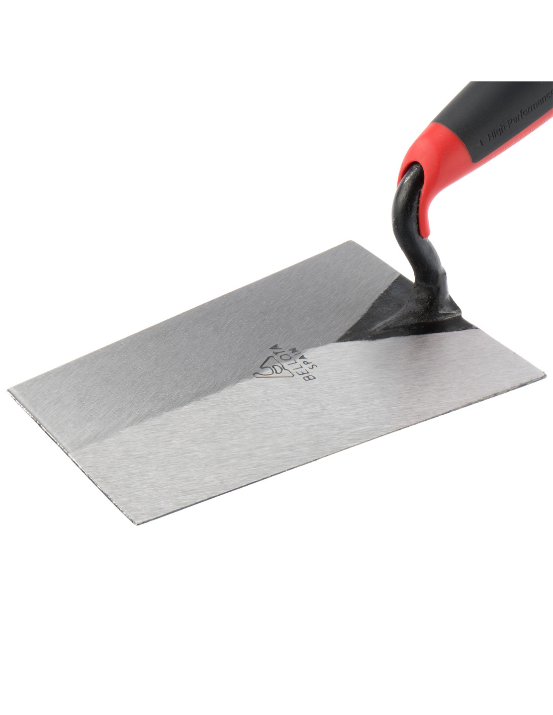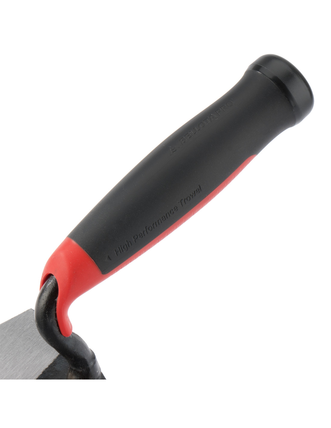 Paleta profesional trapezoidal de acero forjado (irrompible), hoja tratada, garantía de la unión del mango bimaterial con protector del dedo índice y zona trasera de golpeo.