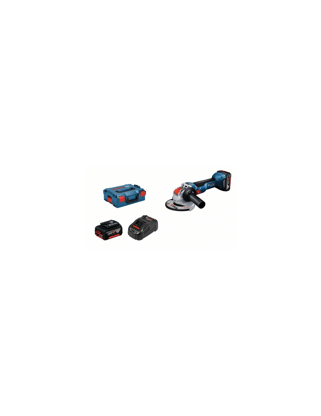 Amoladora angular a batería GWX 18V-10, Nivel de potencia y control de la herramienta mejorados en la categoría de 18 V; con X-LOCK, Ofrece la misma potencia que una amoladora con cable de 1000 W gracias al motor sin escobillas y la tecnología de batería ProCORE18V, Rápido y cómodo cambio de accesorios gracias al sistema de clic de cambio rápido X-LOCK, Las funciones de Drop Control, KickBack Control y X-Brake ofrecen una protección del usuario y una comodidad máximas, 1/1 bandeja para L-BOXX para herramienta y cargador (1 600 A01 166); L-BOXX 136 (1 600 A01 2G0); Caperuza protectora (1 605 510 365); Empuñadura adicional (1 602 025 024); Cargador rápido GAL 1880 CV (1 600 A00 B8G); 2 baterías GBA 18V 5.0Ah (1 600 A00 2U5)