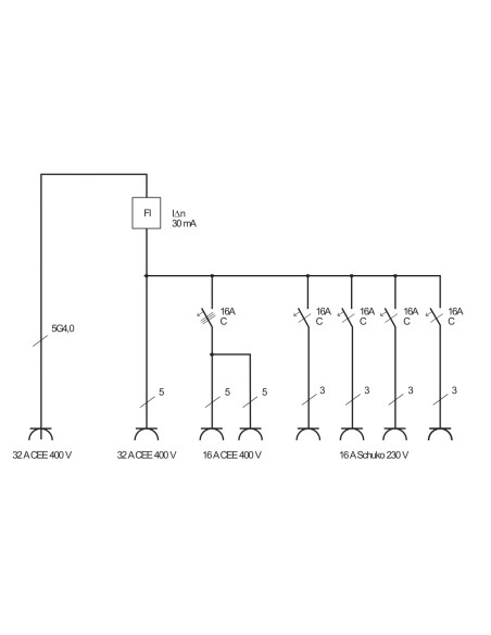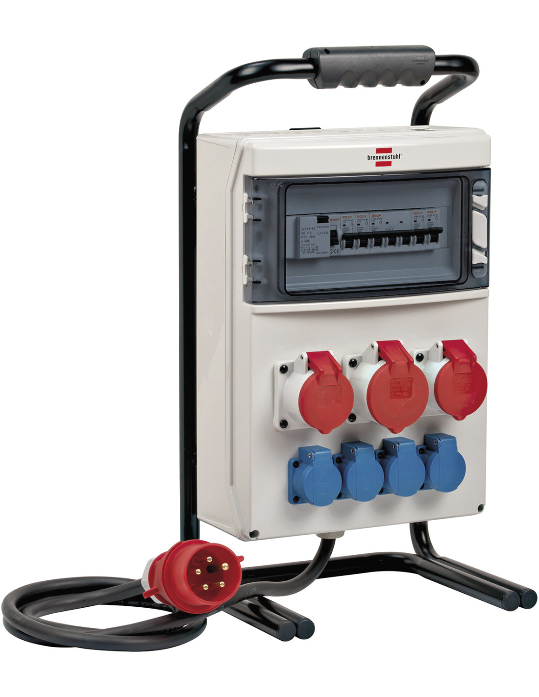 Distribuidor de corriente portátil IP44 para uso en obra y pemanente en exteriores con disyuntor FI, enchufes CEE 1x32A + 2x16A