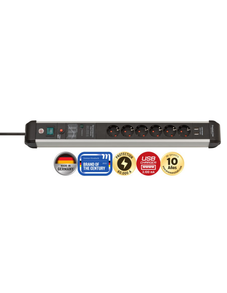 Regleta de enchufes en color negro con 6 tomas de corriente, carga USB y un cable de 3 metros de longtud de alta calidad y seguridad en todas las áreas. La protección contra sobretensiones protege sus dispositivos conectados de las perturbaciones de la red eléctrica, como sobretensiones, rayos indirectos o picos de tensión, con una suma máxima de corrientes de fuga de hasta 60.000 A. La regleta con USB tiene 6 enchufes con una mayor protección contra el contacto accidental.