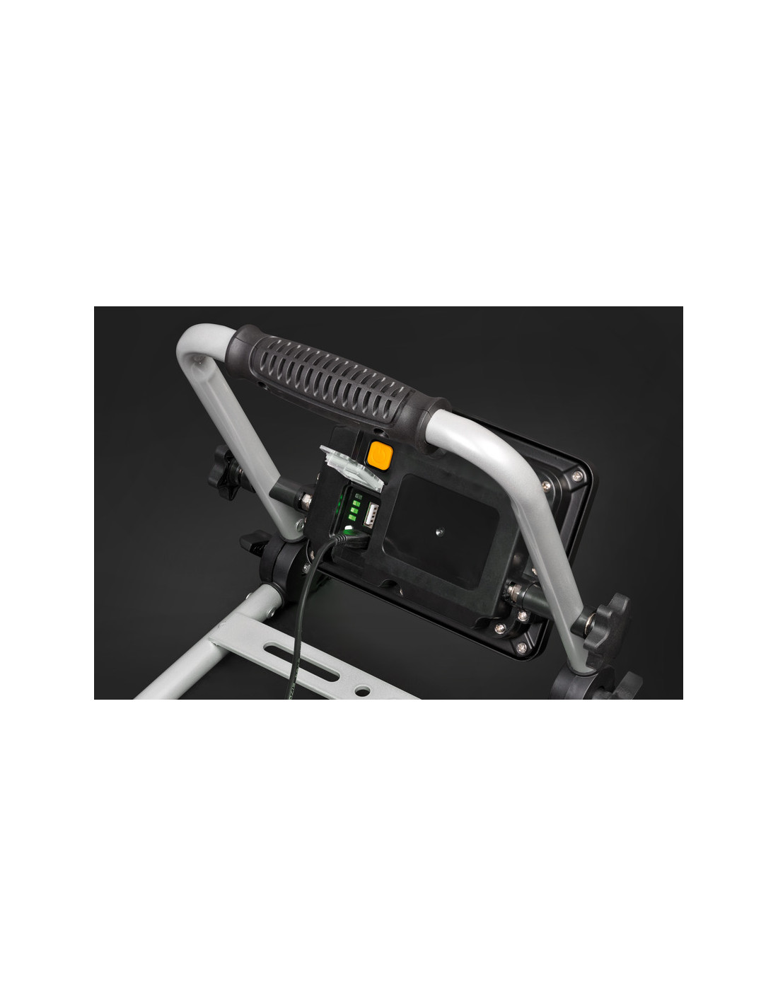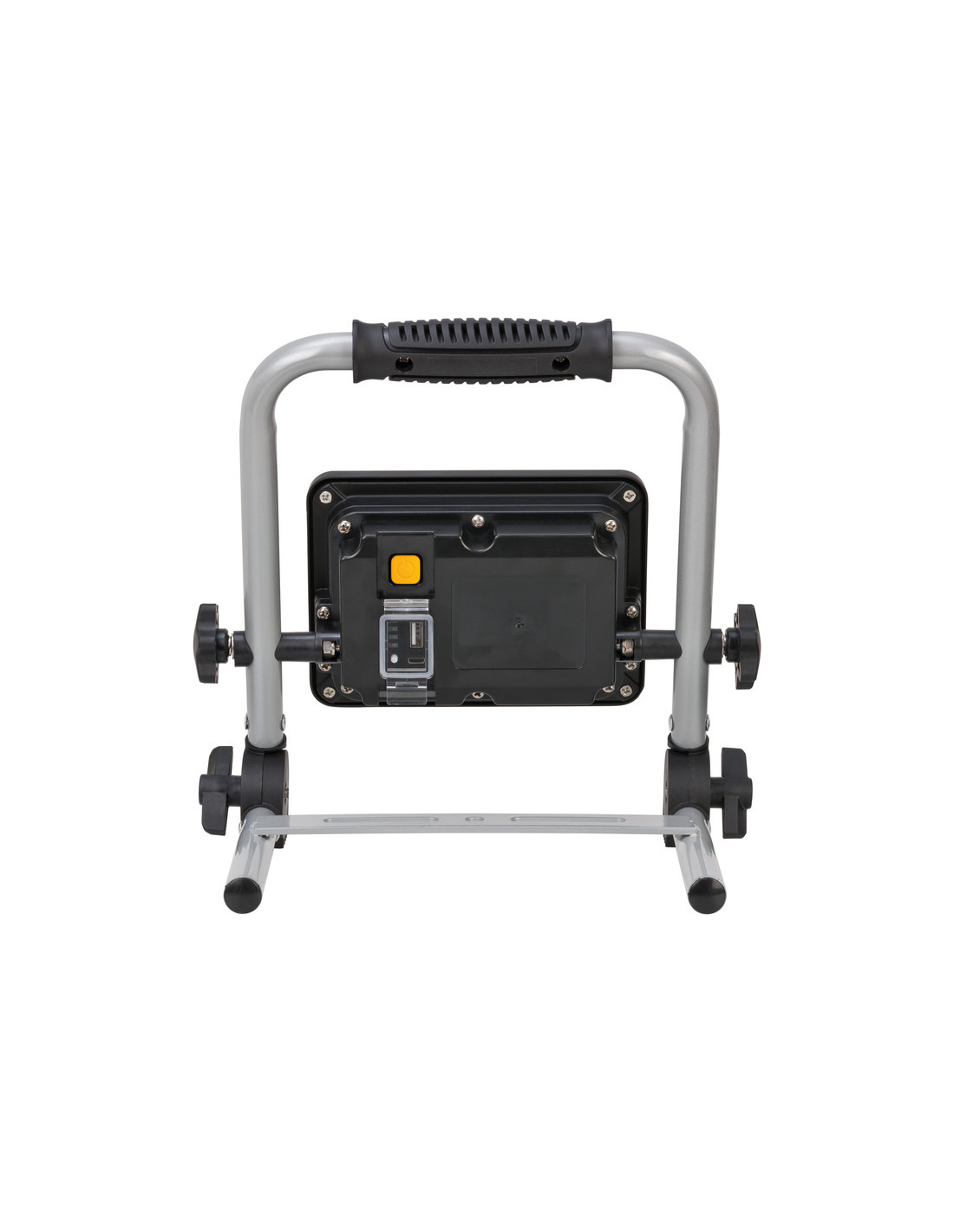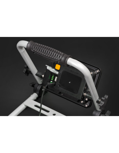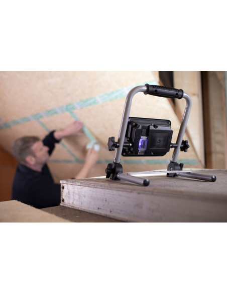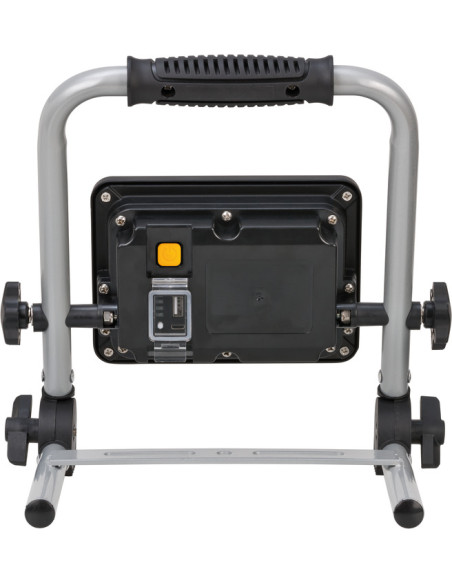 Foco de trabajo de interruptor con función de regulación 100% / 50%. Con batería de iones de litio 3,7 V / 6,6 Ah integrada. Indicador de estado de la batería en la parte posterior. Advertencia adicional de batería baja. Incluye la función de banco de energía.