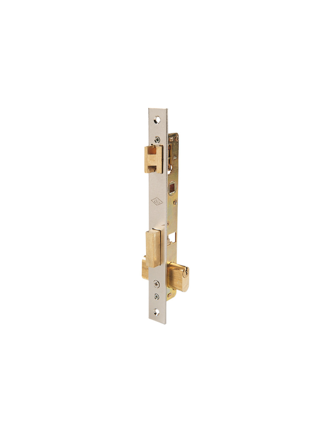 Picaporte reversible de latón accionado por llave, palanca deslizante. Cilindro ovalado (5963). Frente niquelado.