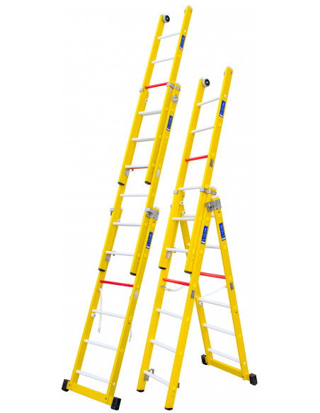 La escalera 3 tramos Arizona de fibra de vidrio es multifuncional, ya que ofrece la posibilidad de usarla en tijera, en tijera con un tramo extensible o en modo extensible manual.