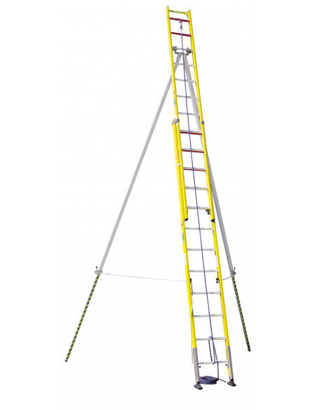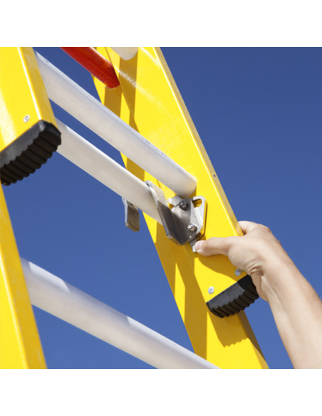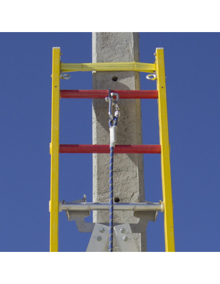 Escalera de fibra extensible manual que dispone de un punto de anclaje en el último peldaño, permitiendo que el operario se ate a la escalera mediante una línea de vida.