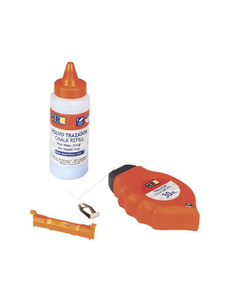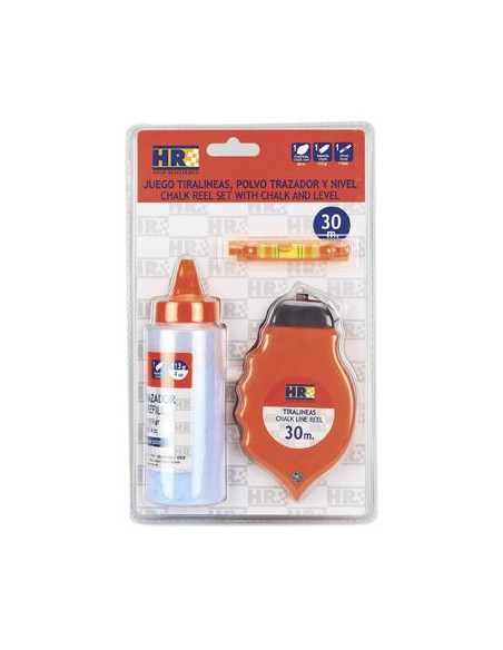 Juego en blister de tiralíneas con cuerda de 30 m., bote de polvo trazador azul y mini-nivel para construcción HR Alyco