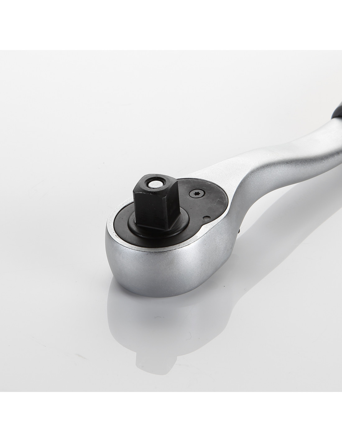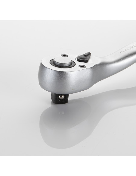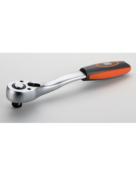 Llave de carraca acodada con cuadradillo de 1/2" de 72 dientes para aprietes de tuerca hexagonal con vaso. Carraca con inversor y expulsor de vasos Alyco.