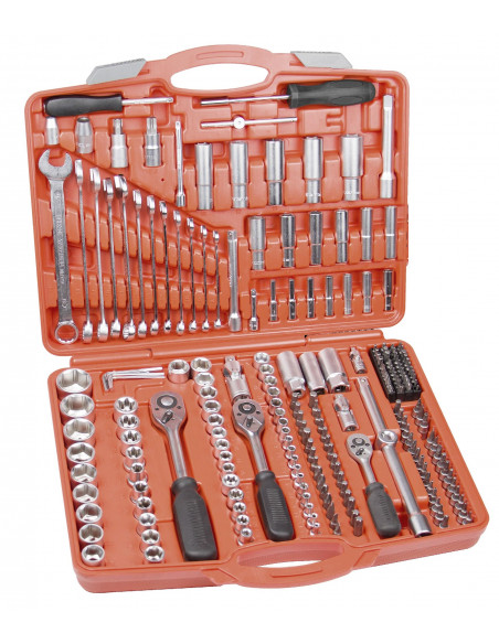 -Composición ½”: 15 vasos (10 a 32 mm) / 5 vasos largos (16, 17, 18, 19, 22 mm) / 4 vasos Torx hembra (E18, E20, E22, E24) / 1 carraca con inversor y expulsor de vasos de 45 dientes / 2 alargaderas (125, 250 mm) / 1 junta universal cardan / 1 Adaptador (½”M x 3/8”H) / 1 adaptador de puntas (5/16”) / 2 llaves bujía (16, 21 mm ) / 2 vasos con punta (T55, T60) / 30 puntas 5/16”.