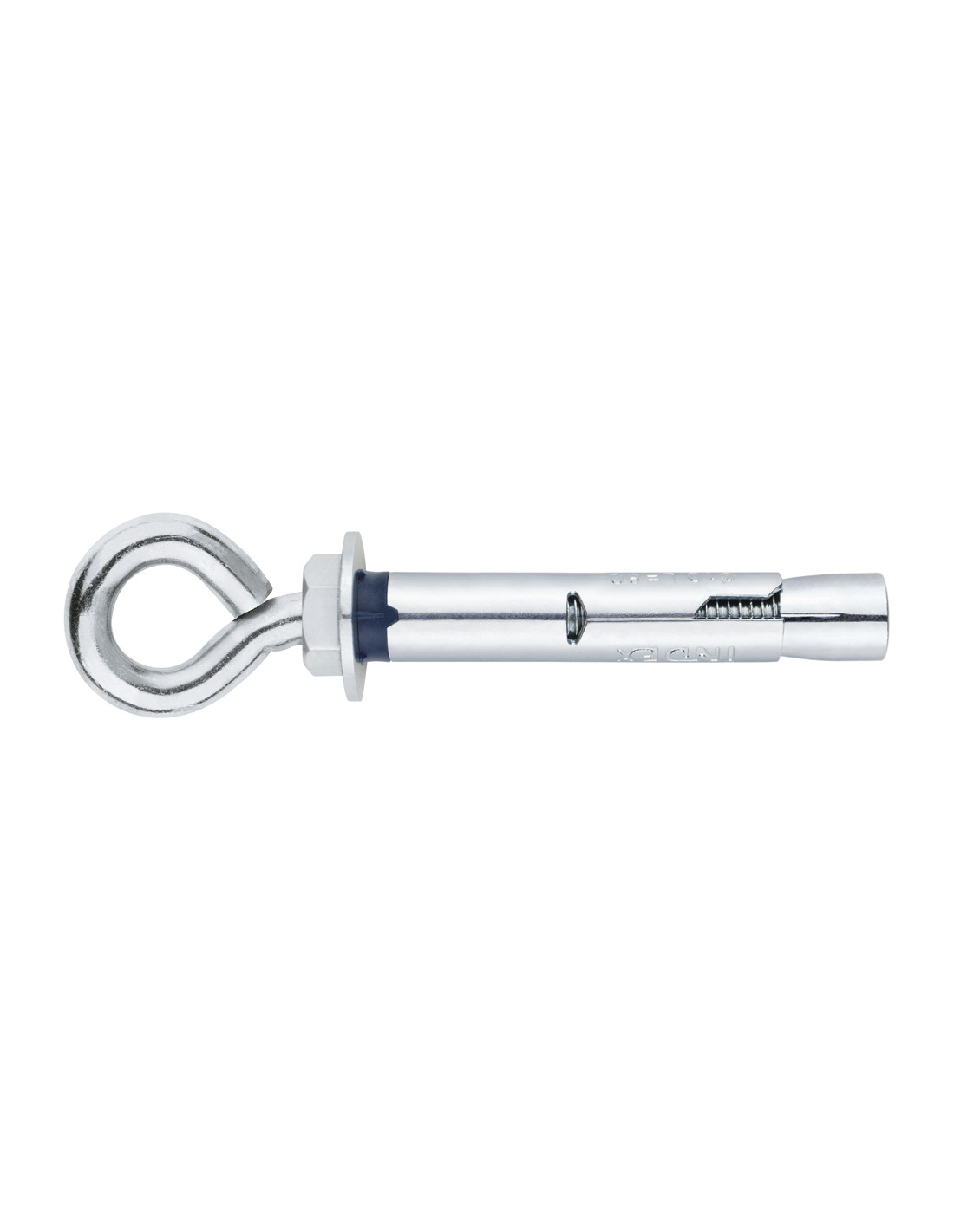 Anclaje antigiro para cargas medias con argolla y principio de funcionamiento por expansión en materiales macizos. Ha sido diseñado y patentado por INDEX para ofrecer anclajes seguros gracias a sus componentes antigiros incorporados en el casquillo, la camisa y el cono, lo que permite que el anclaje no rote con el apriete.