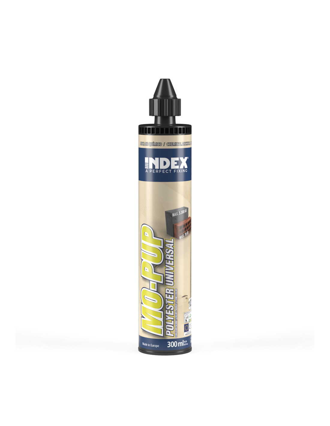 Taco químico a base de resina de poliéster universal. Válido para su uso en todo tipo de aplicaciones en hormigón y también válido para mampostería de ladrillo hueca y maciza.