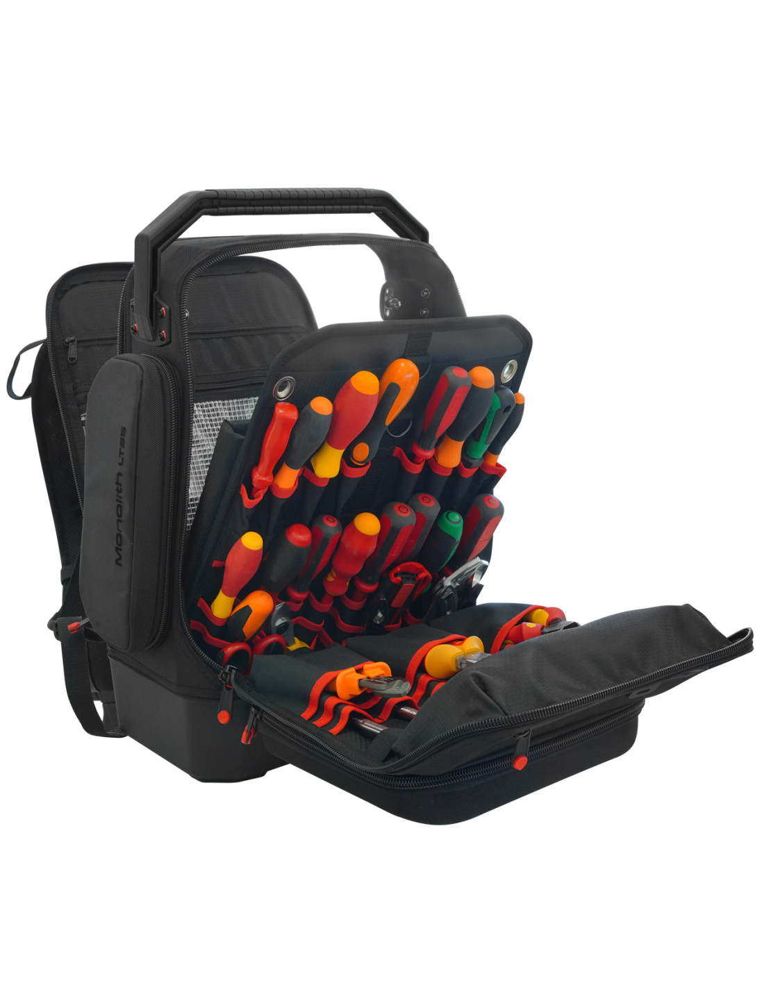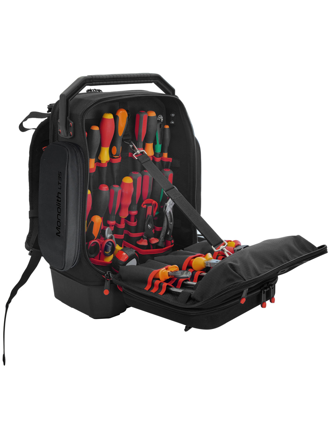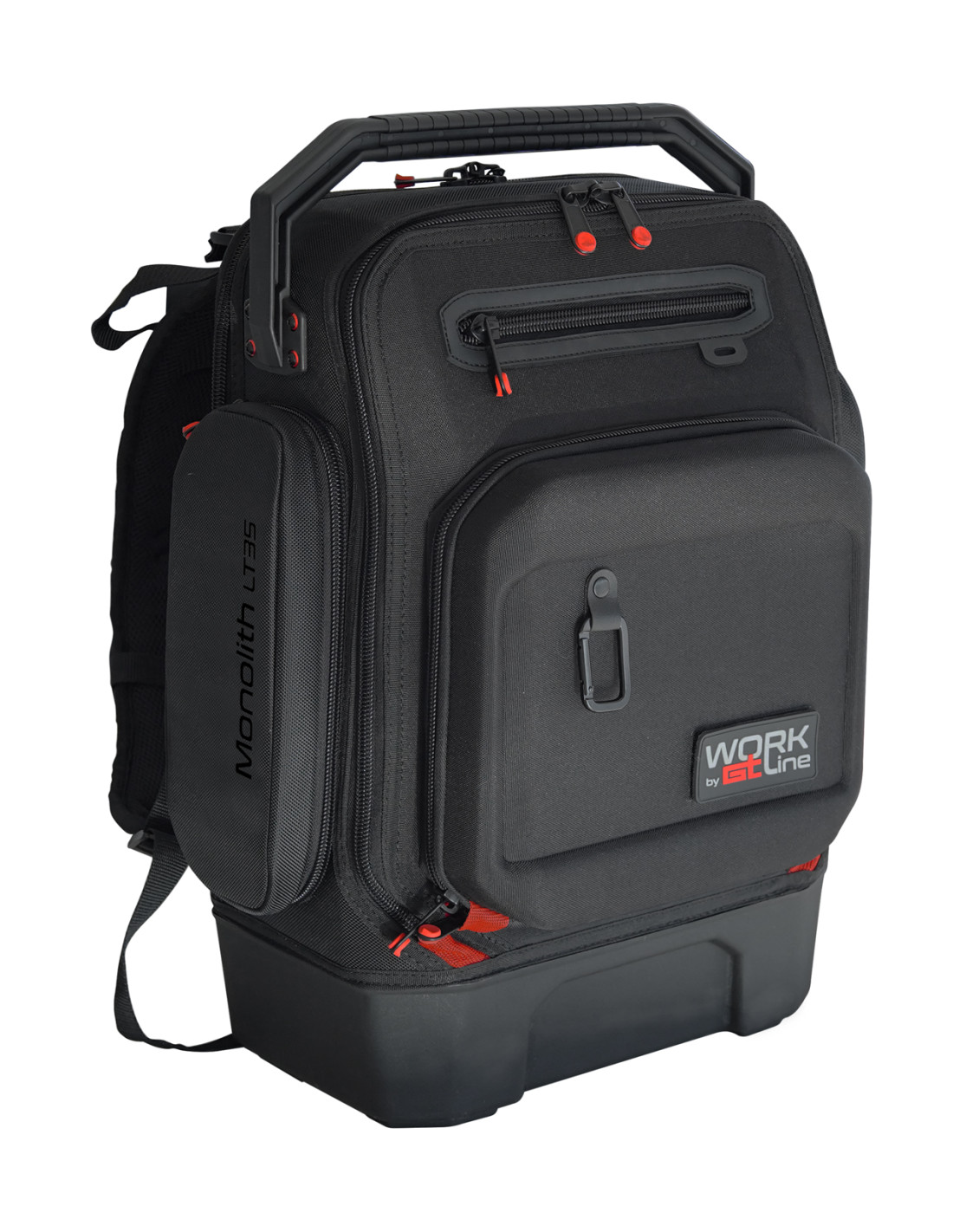 Mochila de herramientas GT Line MONOLITH LT35 con base rígida antichoque, diseño ergonómico y gran capacidad. Ideal para técnicos y uso profesional diario.