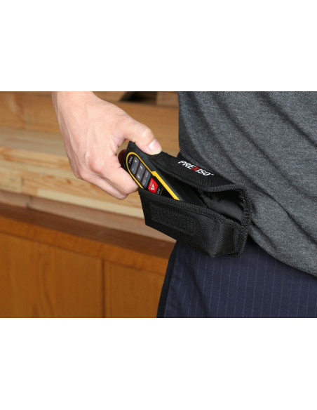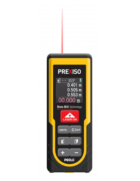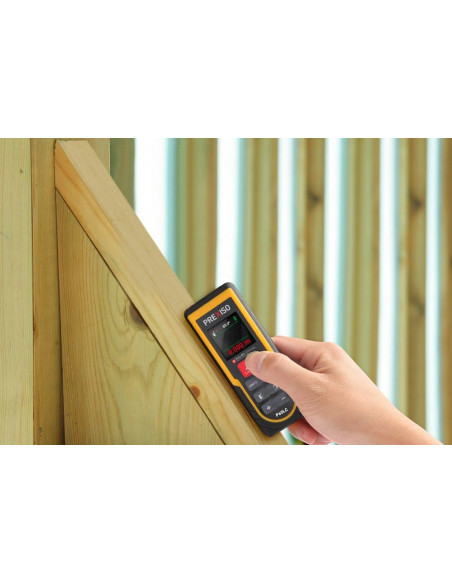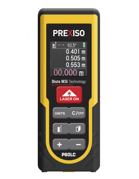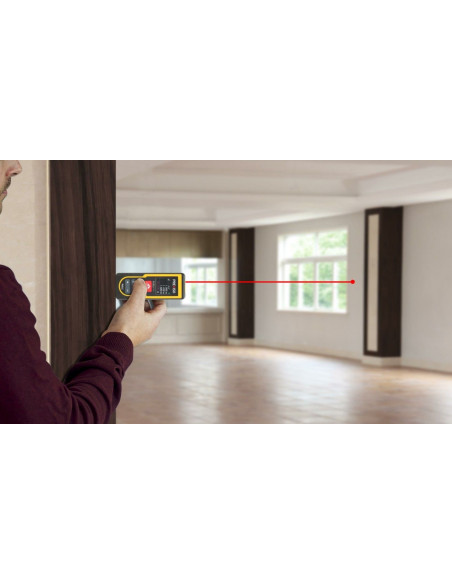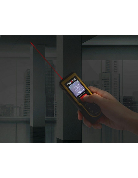 Medidor láser con cálculo automático de áreas y volúmenes, sistema de medidas multifunción (área, volumen, distancia, longitud, pitágoras, suma y resta), medición continua, niveles de burbuja digital para una medición más precisa, y pantalla LCD retroiluminada en color.