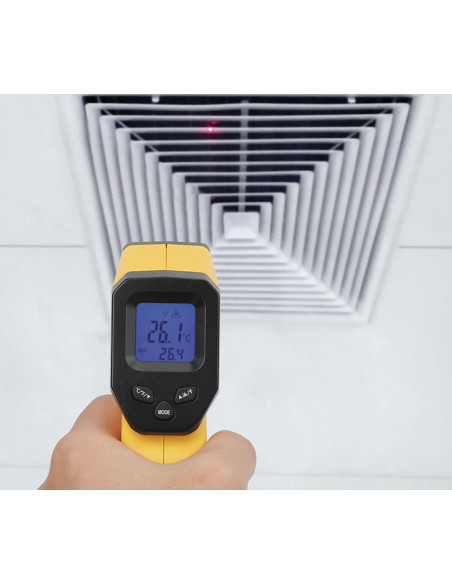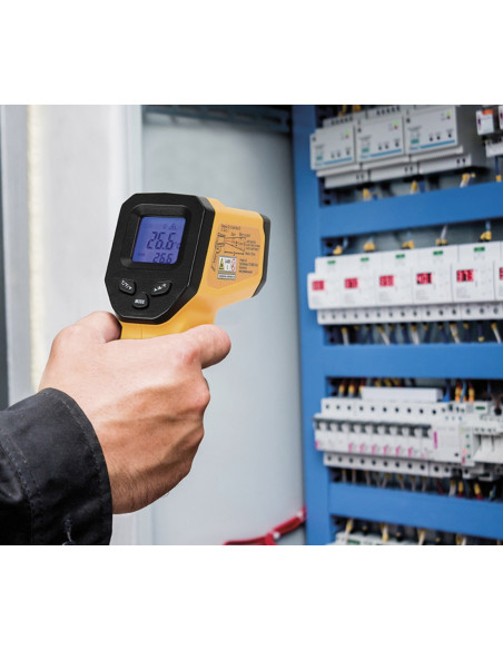 Gracias a su rayo láser puedes ver directamente dónde estás midiendo mide la temperatura (el rayo láser se puede apagar opcionalmente). Debido a los diferentes factores de radiación de calor (emisividad) de los diferentes materiales a medir, el factor de emisividad se puede ajustar entre 0,1 y 1 para mejorar la precisión de la medición. La óptica de medición es 12: 1, lo que significa que a una distancia de 12 cm se puede comprobar un área de aprox. 1 cm.