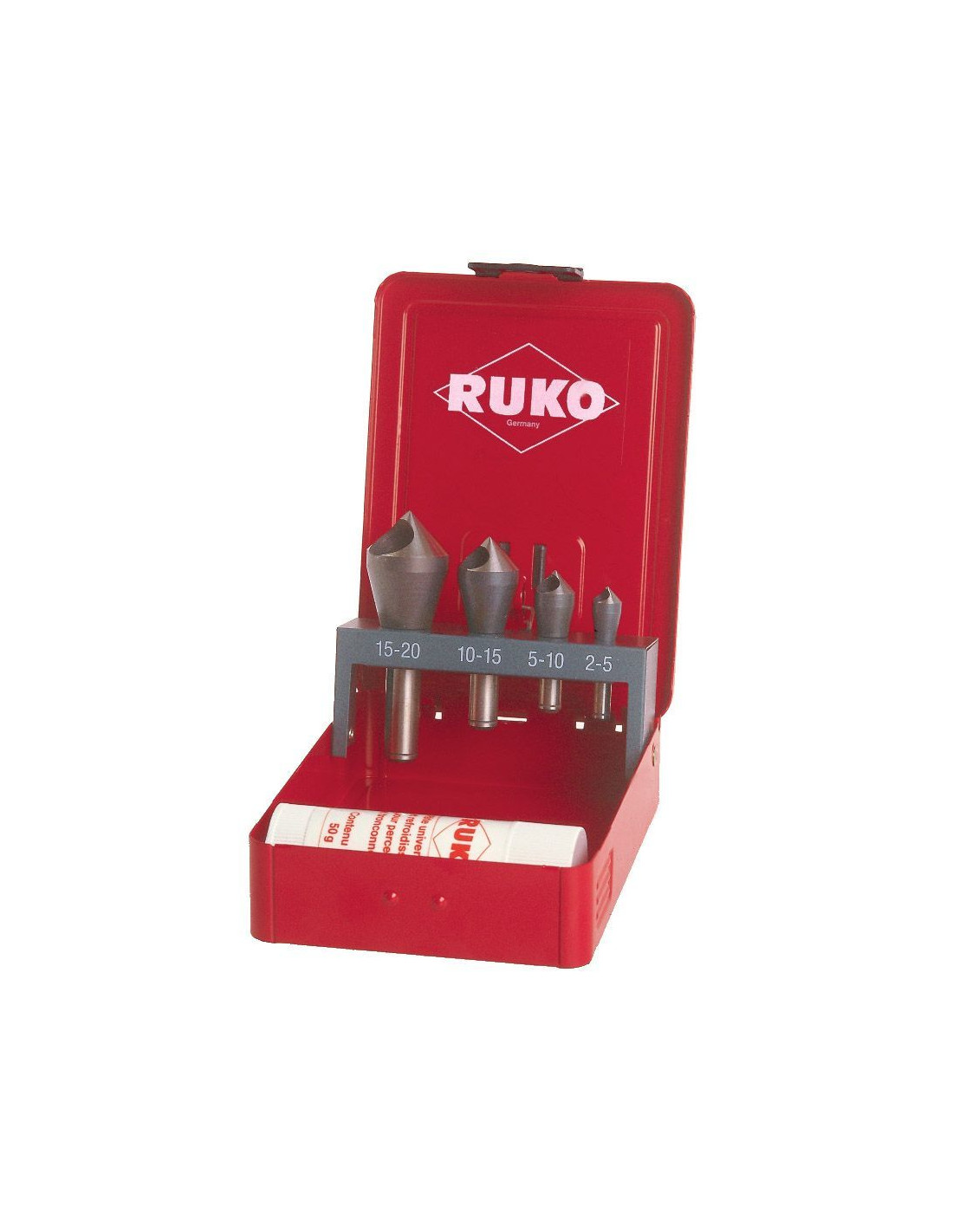 Juego de 4 avellanadores ranurados HSSE-Co 5 y pasta de corte 30 g.