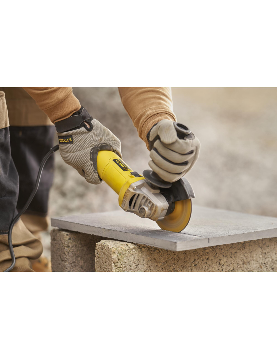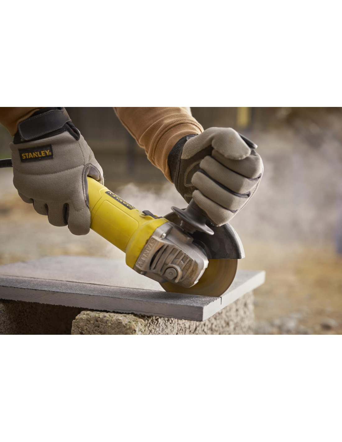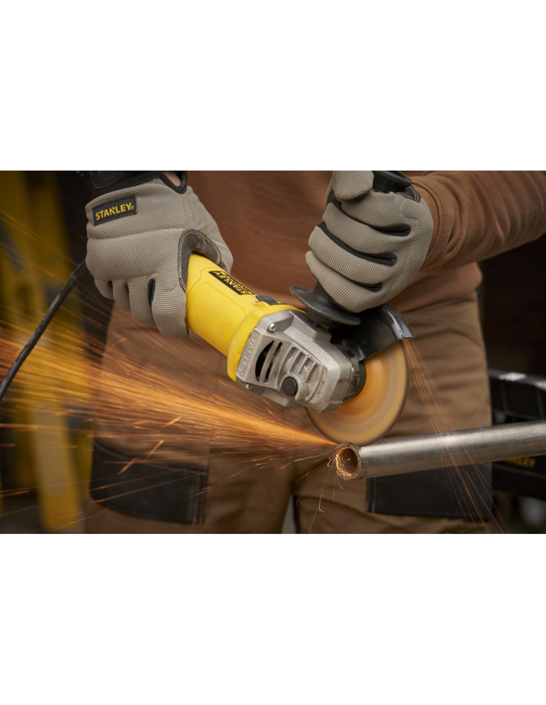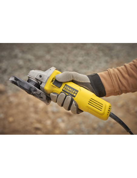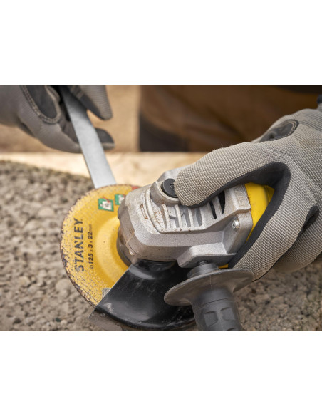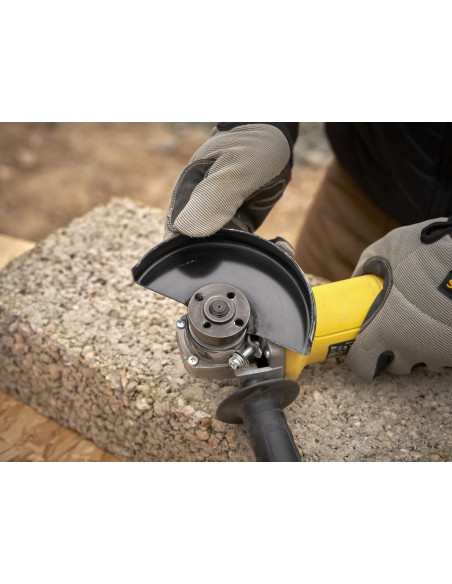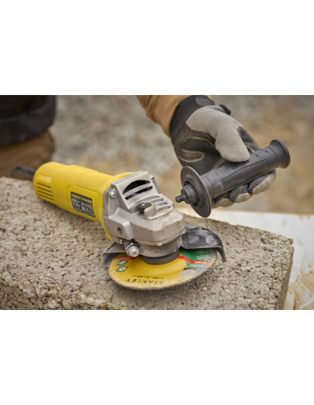 Mini-Amoladora 600W 115mm, velocidad 12.000 rpm, rosca del eje M14, protección contra re-arranque y arranque suave. Incluye empuñadura lateral