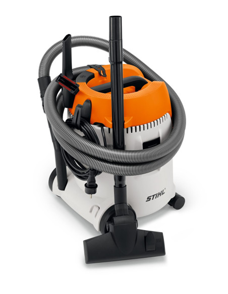 Enchufe con encendido automático (E) para la conexión de herramientas eléctricas. Aspiración de sólidos o líquidos a elegir. Función de soplado enchufando el tubo de aspiración a la conexión de aire de salida. Sistema de filtro múltiple con fácil limpieza del filtro. Manguera de aspiración de 3,5 m de largo. Tubo de aspiración telescópico. De serie con boquilla para suelos, boquilla universal y boquilla para ranuras..