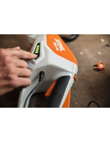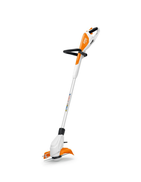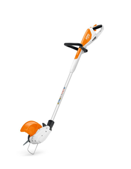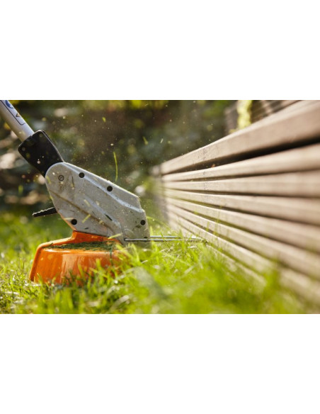 Compacta desbrozadora de batería para limpieza alrededor de la casa. Batería integrada, con indicador de carga, manillar ajustable sin herramientas y ángulo de corte para trabajos verticales.